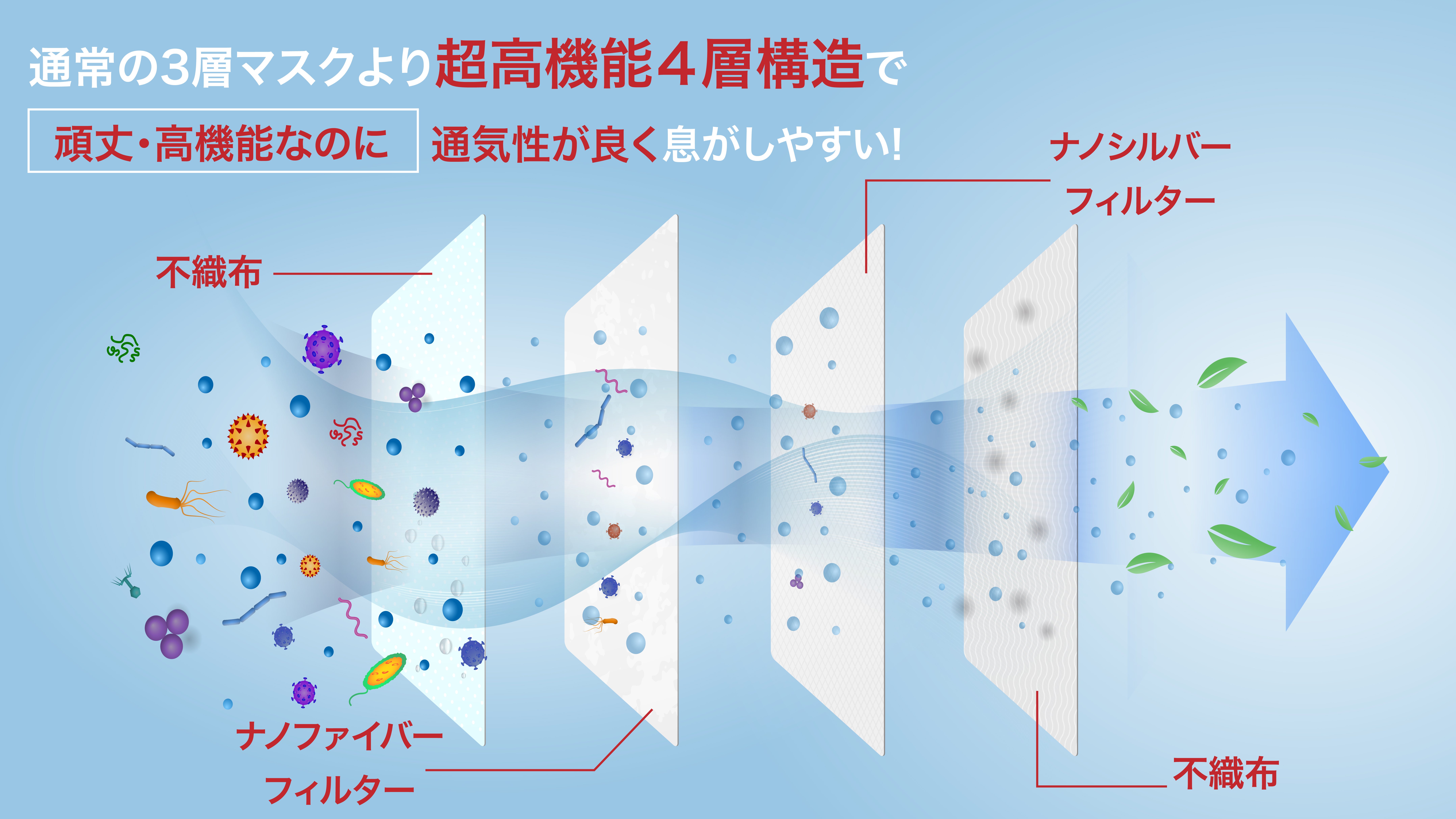そして、Withコロナとしてコロナとともに生命活動を維持しなくてはいけない今、 目指したのは高機能フィルター2種をぜいたくに使った4層構造による高機能マスクです。