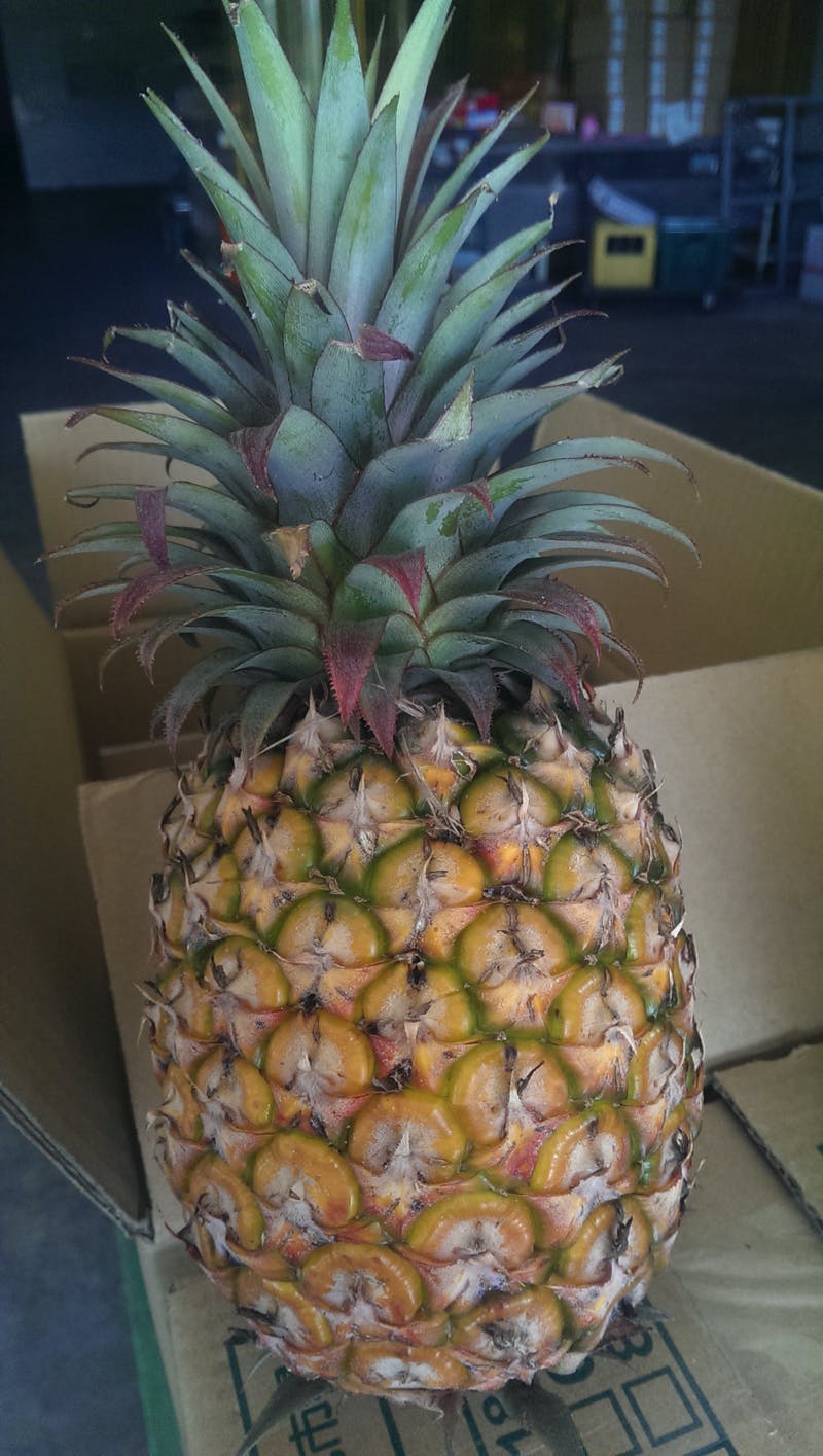 パイナップルが到着しまして、1つ食べました。 頭の方が熟していました。 葉っぱがついている方は熟しきっていませんでした。 頭は蜜が入っていました。芯まで食べられておいしかったです。 イオンで売っている台湾パイナップルより大きかったです。 こんなにおいしいパイナップルを中国は輸入禁止にするなんておかしいです。