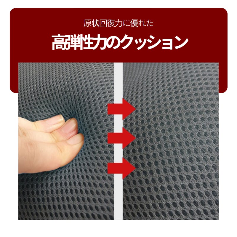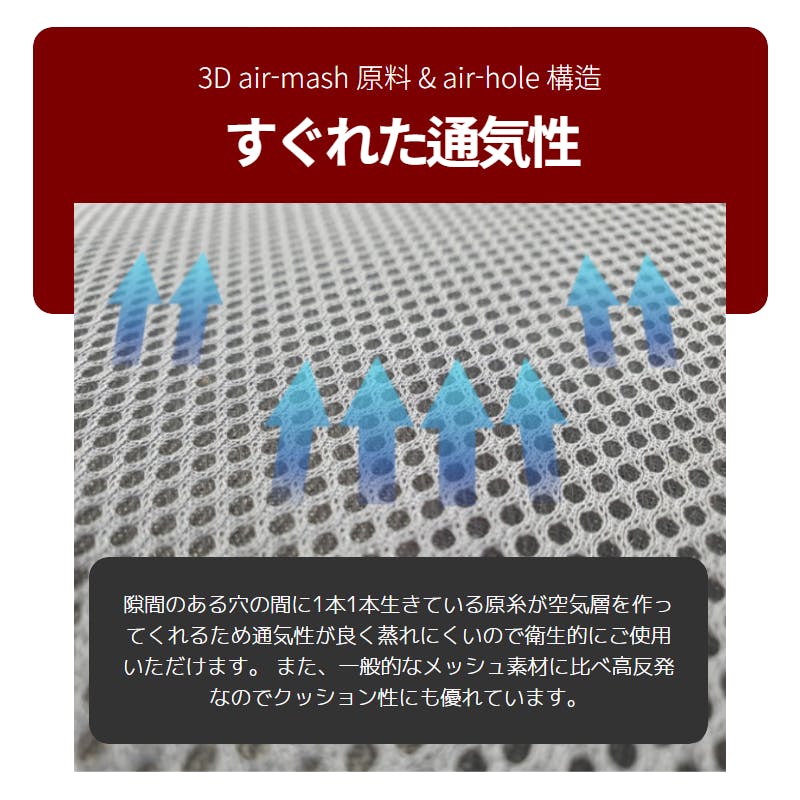 ペルビスチューナーはair-mash素材を利用し、空気層を作り出します。 通気性が良いため蒸れにくく、衛生的にご使用いただけます。 また、一般的なメッシュ素材に比べて高反発なので長時間座っていても変わらない座り心地を体感していただけます。