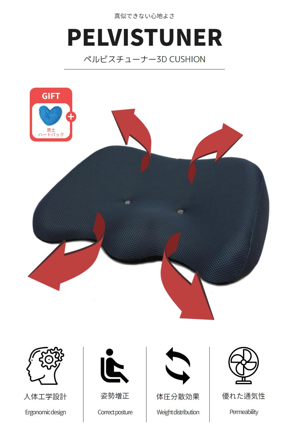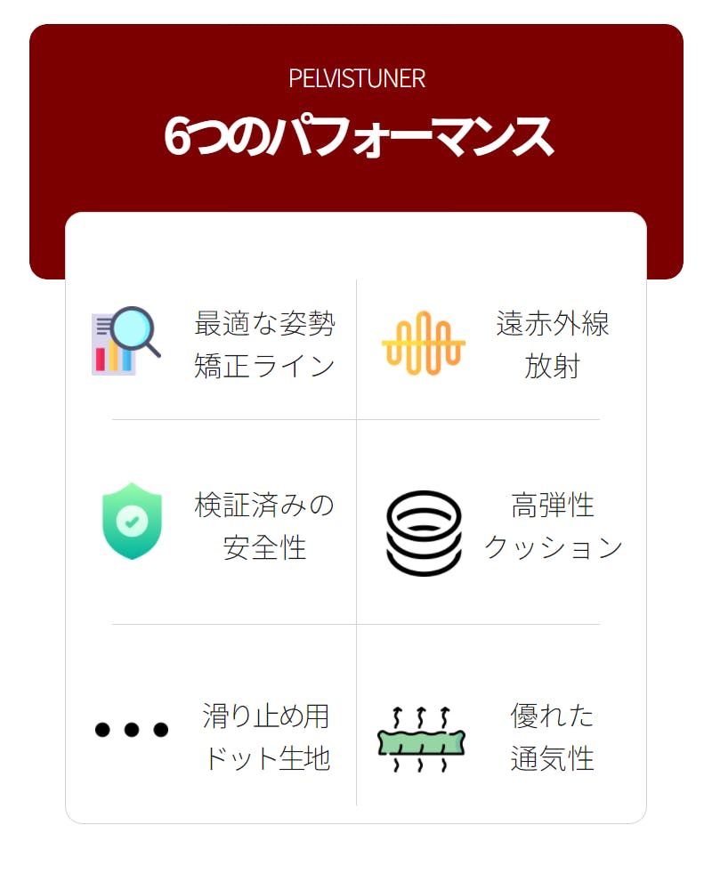 腰に最適なラインを得るためにペルビスチューナーは長年研究を重ねてきた結果、腰と骨盤の健康を担う最適なラインを見つけました。 ペルビスチューナー姿勢矯正クッションは、人体工学に基づいて設計し、体重を分散させることで腰を楽にする効果があるので安定した姿勢を維持してくれます。
