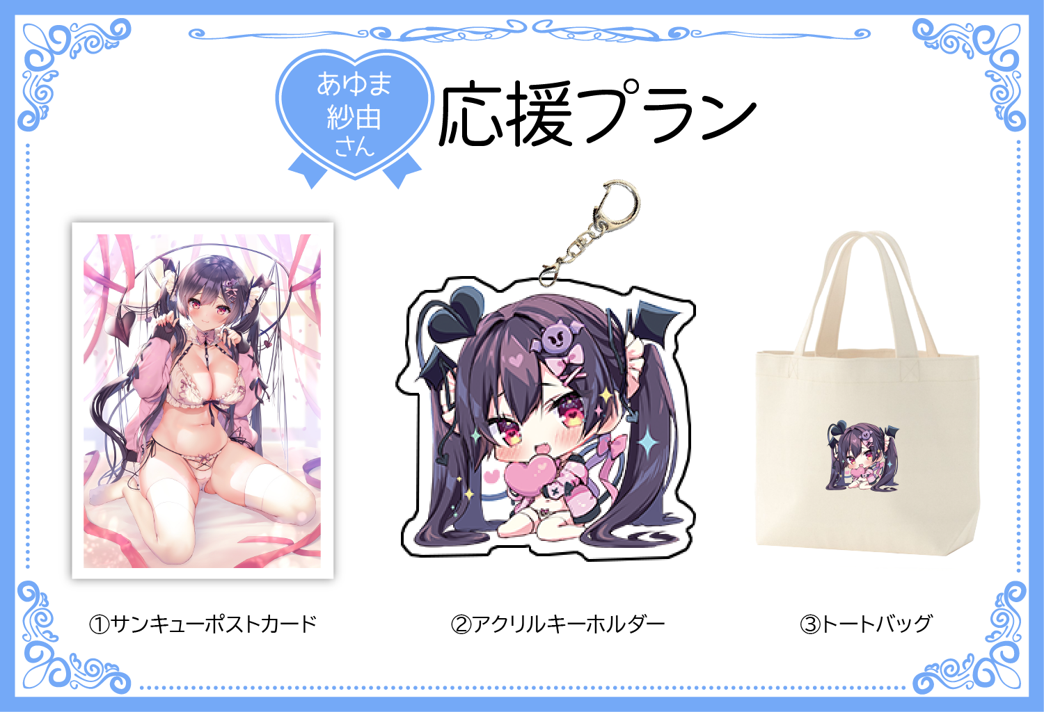 コスチューム以外にもあゆま紗由さんが今回の為に描き下ろしたSDキャラのファングッツや、りあすちゃんのイラストを高品質プリントで楽しめるアクリルアートをご用意して頂きました。