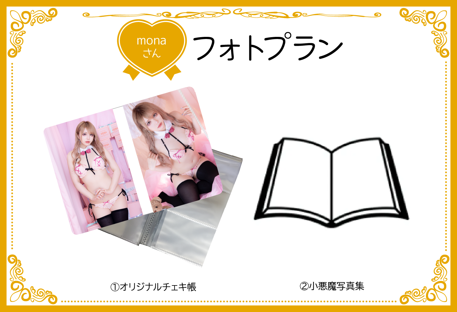 monaさんのオリジナルチェキ帳と小悪魔写真集で魅力的なmonaさんの写真がたっぷりなプランです!
