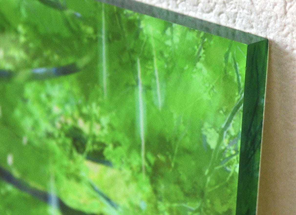 画像の様に厚みのあるアクリル板に、全12色の超高性能プリンターで印刷した高品質なイラストを接着しています。アクリルに直接印刷した従来のUV印刷とはくらべ物にならない程の圧倒的な画質を誇ります。アクリルアートをそのまま飾るための台座も付いてきます。