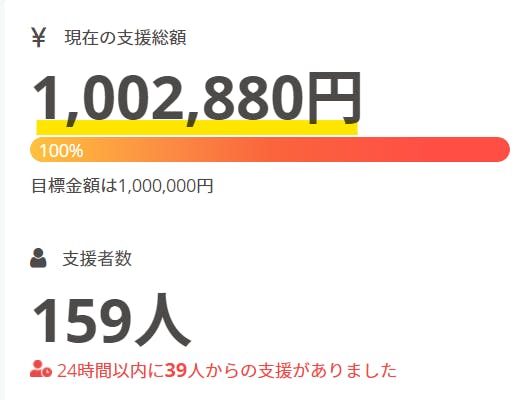 ということで、昨日だけで39名の温かいご支援のお陰で、何とかプロジェクト達成致しました。