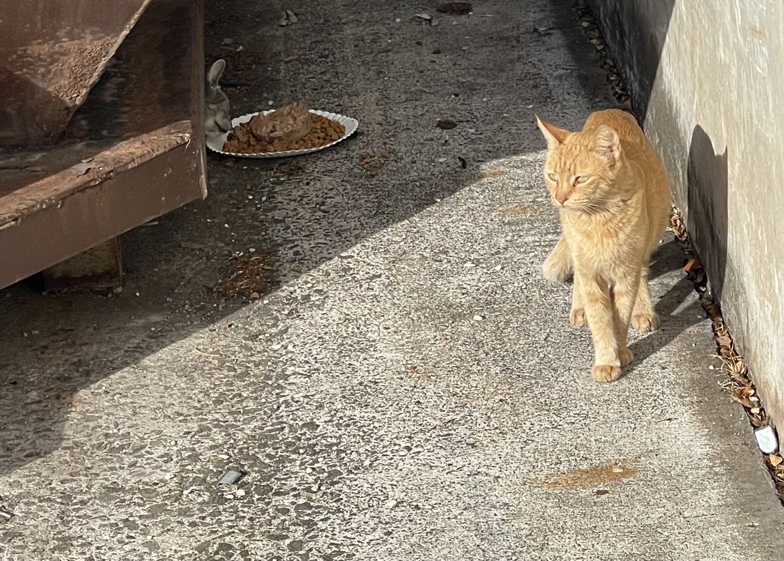 以前からここに、子供がいるグレーのママさん猫がいるから、保護して避妊をした方がいいと報告がありトラップを仕掛けたところ、この日にカゴに入ってくれたのはこのオレンジの子でした。少し垂れ目で、いつもご飯をもりもり食べる可愛い女の子の猫でした。目的のグレーの子は諦めて、このオレンジの猫を翌日避妊手術に連れて行き、様子を見ているとご飯も食べて元気そうです。