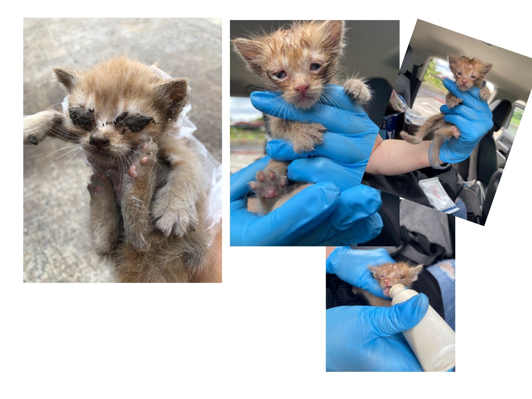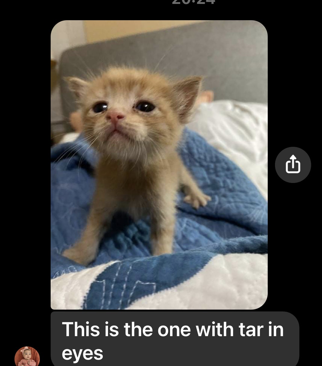 前回ご報告しましたが、オレンジのママには4匹の子猫が残されていました。オレンジのママは私に子猫を託すように子猫達を外に呼び寄せていたかのようでした。まず、二匹を保護した後、もう一人のボランティアさんが一匹を保護、最後の女の子の子猫は、ごみの収集の車の下に隠れていて、声はするのですが姿が見つからず、翌日にようやく収集車の下にいるところを保護する事が出来ました。上の写真は、その末っ子の子猫の様子です。 ごみの車の下なので、相当劣悪な環境だった為か、この最後の子猫は両目とも真っ黒なタールで覆われていて、目が全く見えない状態でした。ナタリアさんという猫に詳しいボランティアさんが、慎重にタールを拭いてくれてようやく目を開ける事が出来たのです。