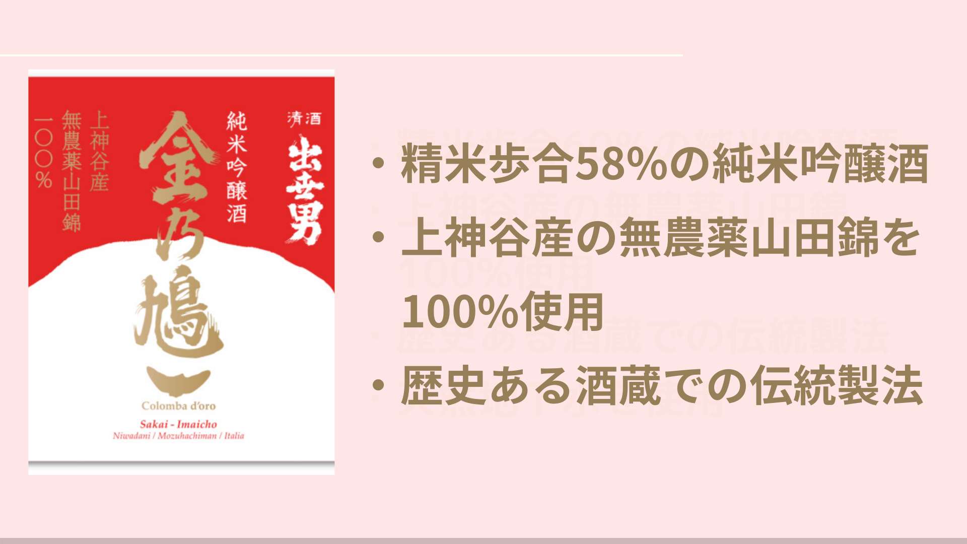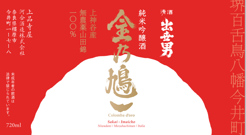 かつて酒米の名産地だった堺・上神谷(にわだに)で育てた無農薬の山田錦を使い、堺と縁の深い奈良・今井町の老舗の酒蔵「河合酒造」で醸す純米吟醸酒「金の鳩」。