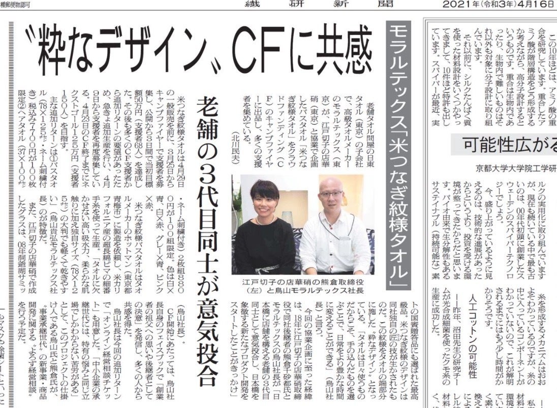 繊維ファッションビジネス専門紙の繊研新聞2021.4.16付にて、当社のクラウドファンディングについて、大きく掲載いただきました。承継世代の経営相談についても詳しく取り上げ頂き、とてもありがたいです。取材いただいた北川様、いつもありがとうございます。記事は、画像をご参照ください。