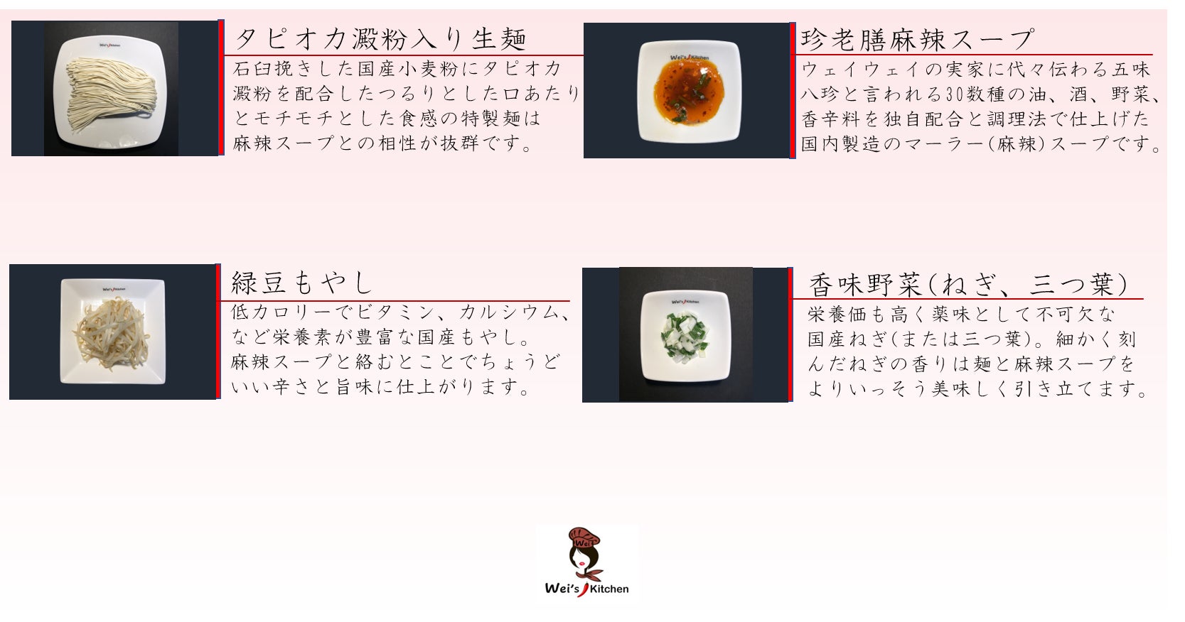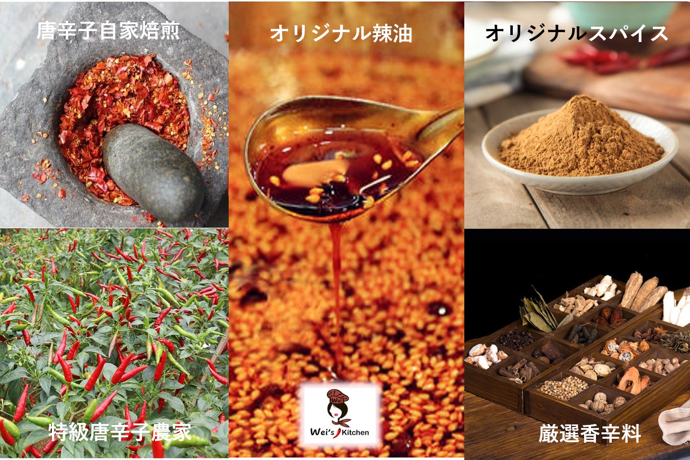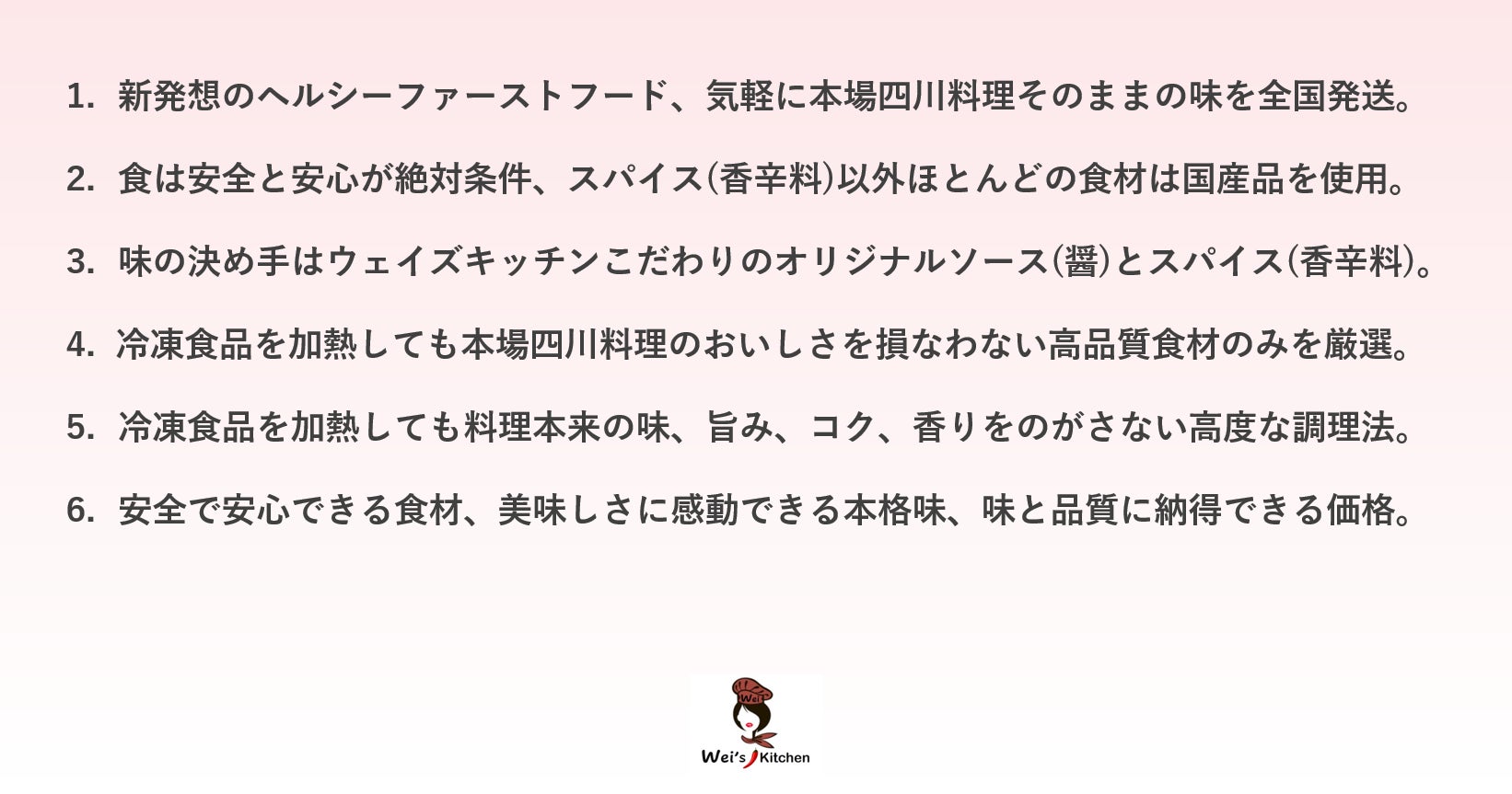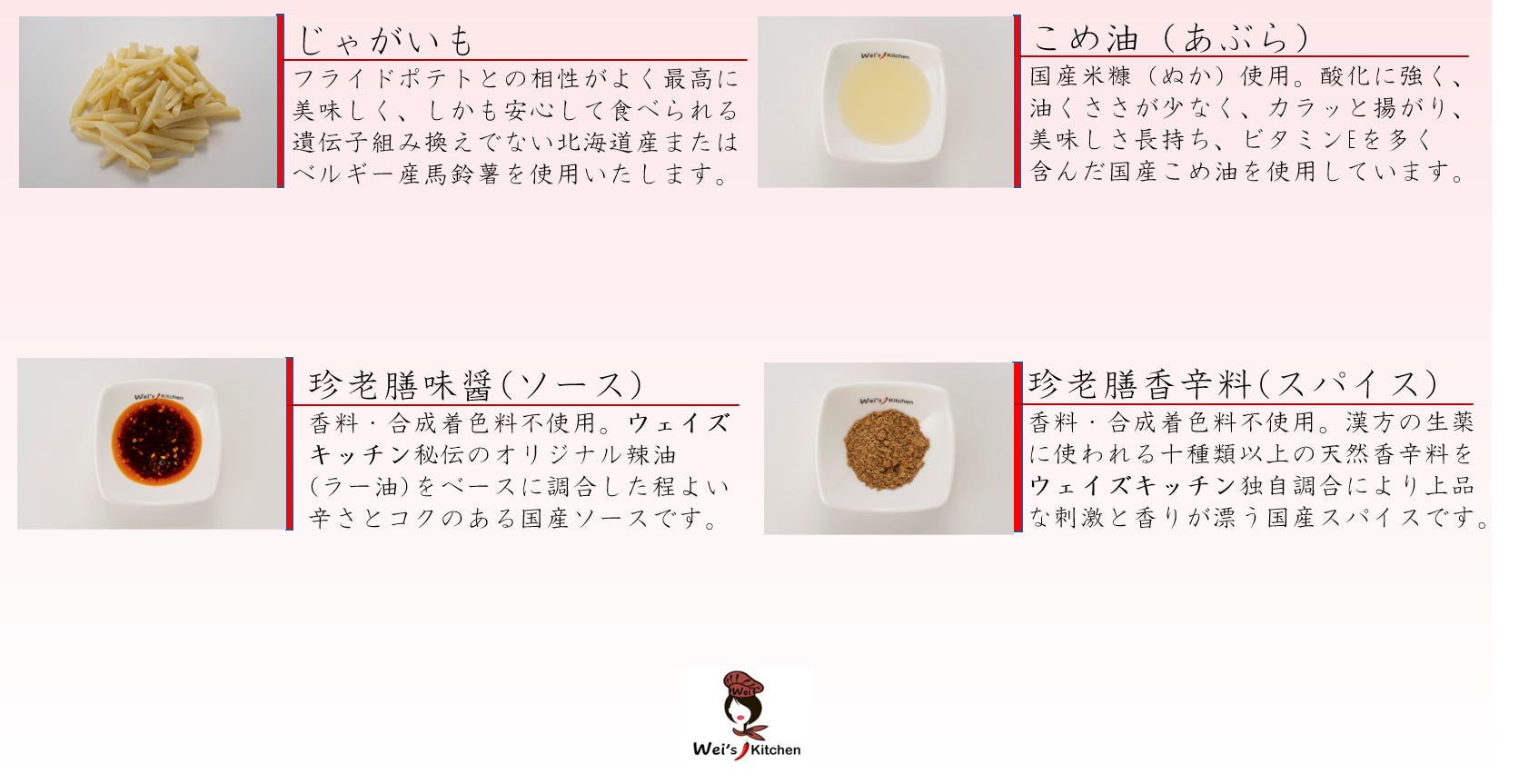 「ウェイズキッチン」は、四川省でしか入手できない香辛料以外ほぼすべて国産の食材を使用しています。この10年間で日本で知り合えたすばらしい多くの知り合いの方々(10代後半~60代までの男女)に何度もテイスティングの協力をしていただき、本場四川そのままの味で<食べたことがない旨みと香り><あっさりしているのにコクと深みのある旨さ!><辛いけどおいしい!><クセになる新鮮な旨みと香り!><冷凍から加熱した料理だと思えない旨みと食感!>などと言っていただける香味フライドポテトと四川マーラー麺に決めることができました。
