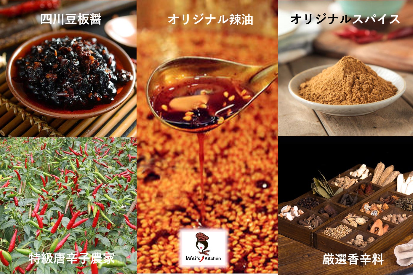 30数種類の国産こめ油、国産ごま油、野菜、薬味、ラー油、唐辛子、香辛料、四川でしか入手できない3年以上熟成した特級豆板醤などを我が家に代々伝わる調理法で国内製造しました。あっさりしていて深みのある旨みとコク、上品な香りは特級レストランで出してもいいくらい本当に贅沢な麻辣スープです。