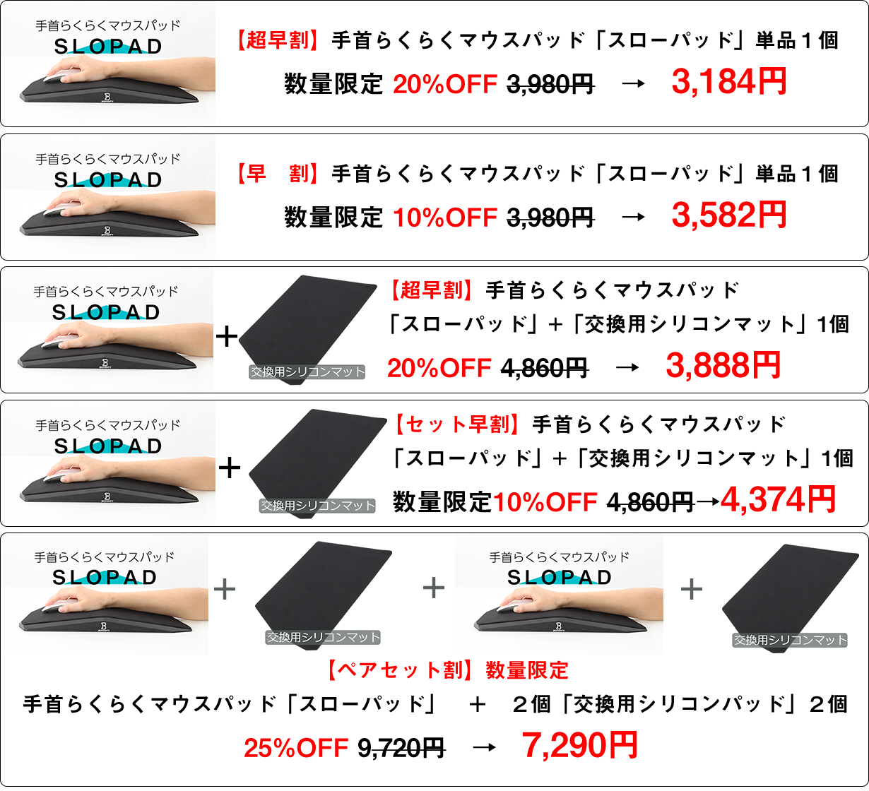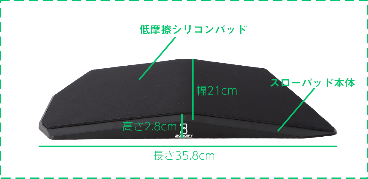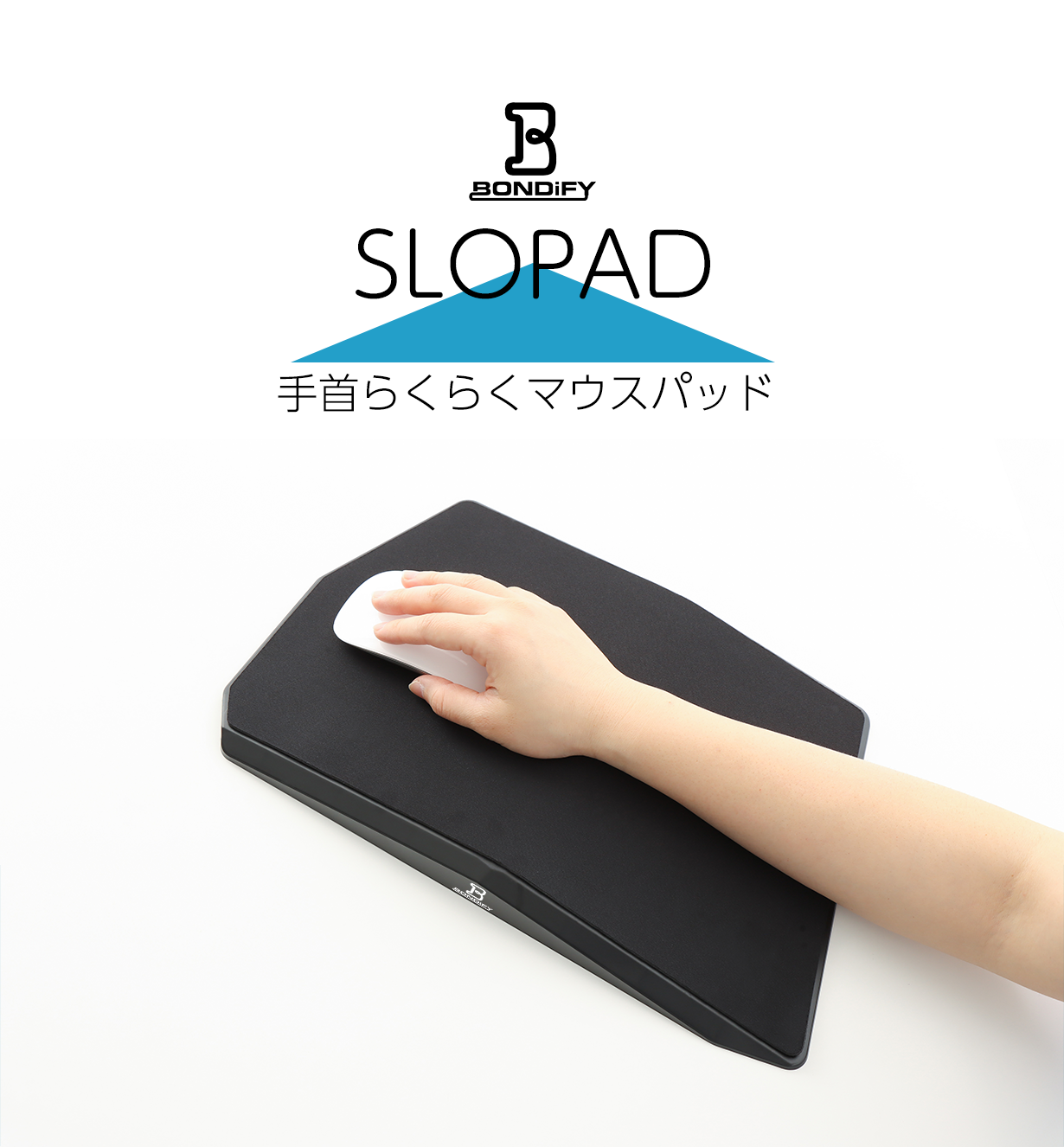「スローパッド」は、手首とマウスパッドに隙間が出来にくいスロープ形状で、手首だけでなく腕全体でマウスを支えることができます。