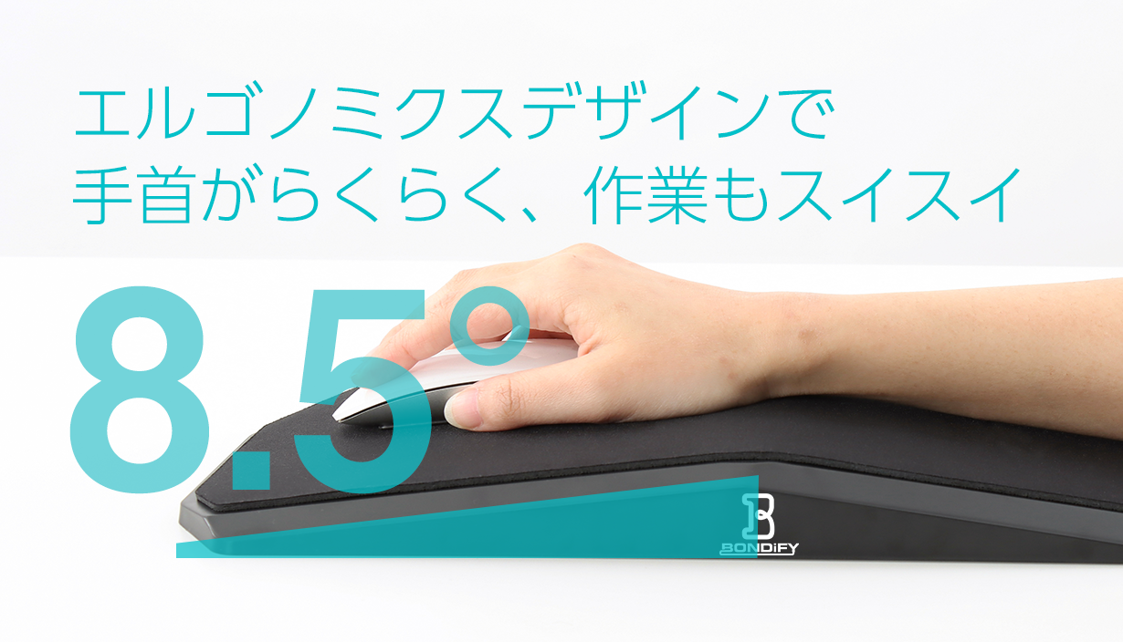 手首らくらくマウスパッドのスロープ角度【8.5度】は手首への負担が少なく、軽快なマウスが可能です。まるで生まれたときからマウスを持っているかのように負担なく操作していただけます。