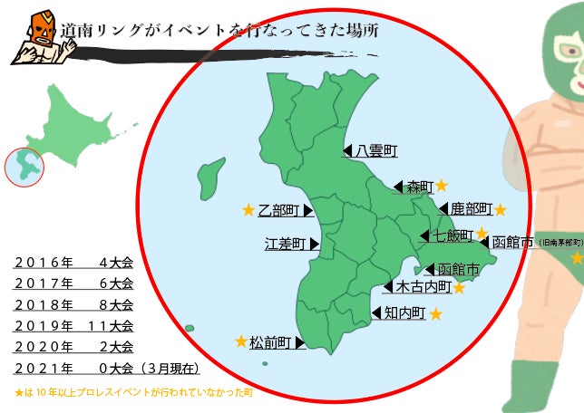 函館市を中心に道南の市町で31大会(16箇所)にてプロレスイベントの開催を行なってまいりました。