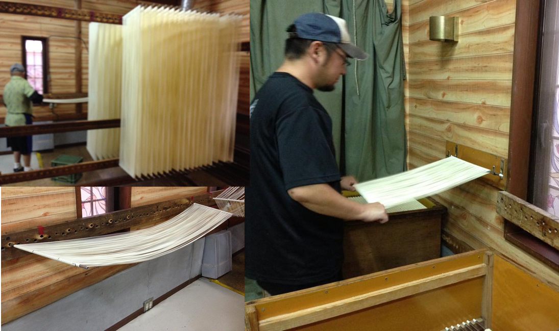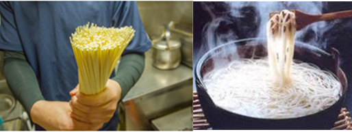 五島には『五島うどん』をつくっている製麺所が30軒以上あります。弊社は、国産小麦粉100%を使っているところから取り寄せています。国産小麦粉は強力粉ではなくてグルテンが少ない中力粉でできており、引きが弱いために、強力粉だと1日でできあがるところが3日かかります。こねてだんご状にして1日寝かせてから伸ばしたり、グルテンが少ないと急速に乾燥させた時に切れやすいので自然乾燥させたりと、時間と手間がかかっています。けれど、細いのにモチモチとしてコシが強く、喉越しもすごくいい麺です。