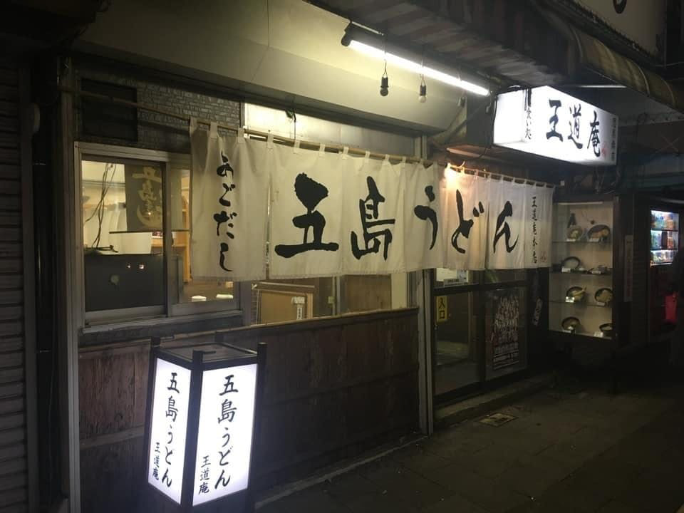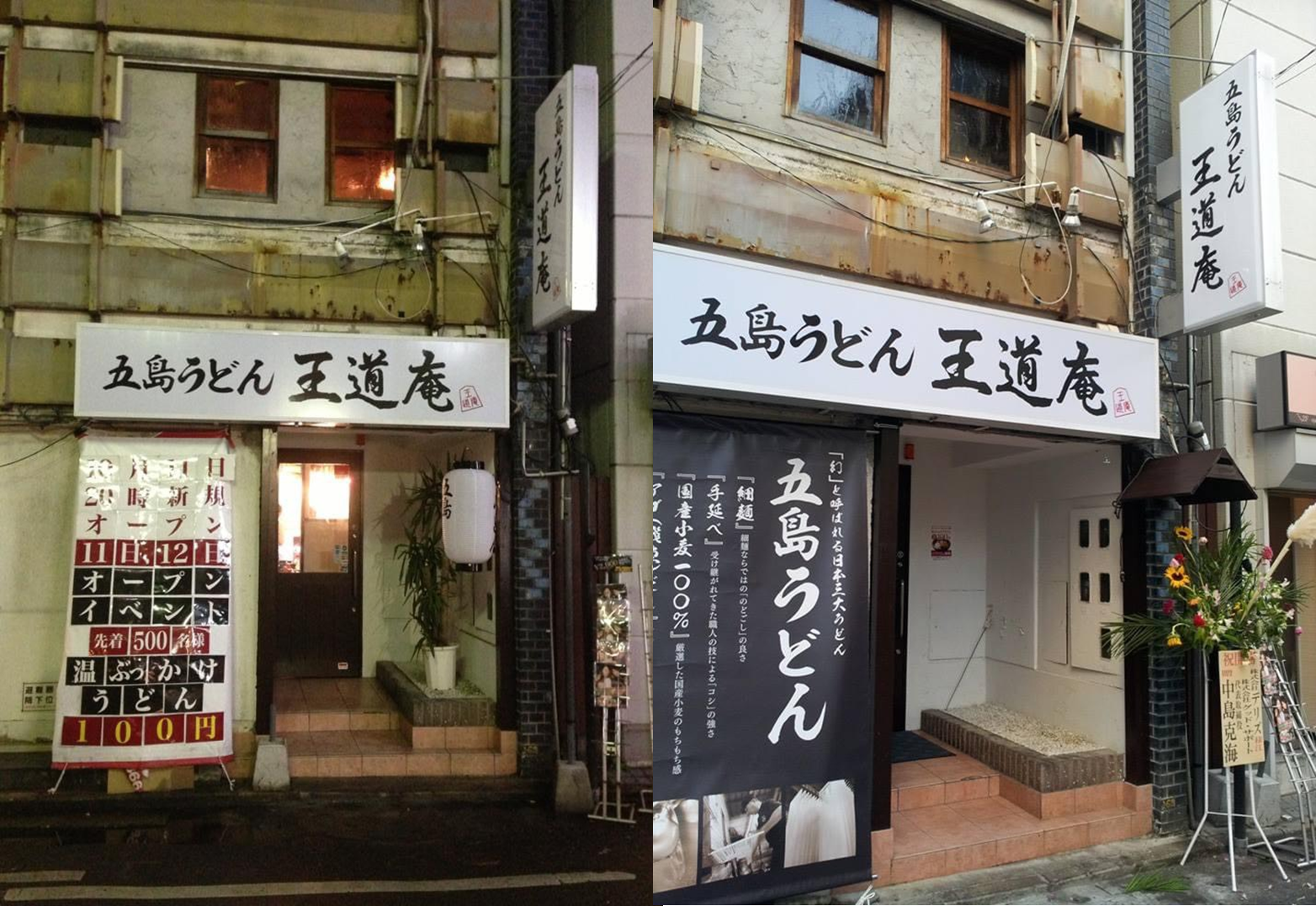 1階カウンター7席と2階カウンター4席、6人掛けのボックス席1テーブルの狭いお店に最高で180名入れた事もあります。近年では出張族の方々の口コミで、「【長崎に来たら「王道庵」の五島うどん】を食べて帰らんば思案橋に行ったと言えんばい」って言われたと沢山の出張族の皆さんにご来店頂き、来た証にと記念に壁に名刺を貼って帰られるようになり、壁中幾重にも名刺が貼られてました。また、10周年記念イベントでは地元の若者達に取り持って貰いTV局のホールを貸切り、200名余りの方に九州管内から集まってお祝いして頂きました。ホントこの10周年記念イベントは私の財産です。この様な感じで王道庵は沢山の方に愛され、支持されたお陰で18年も続けて来れたと心より感謝しております。