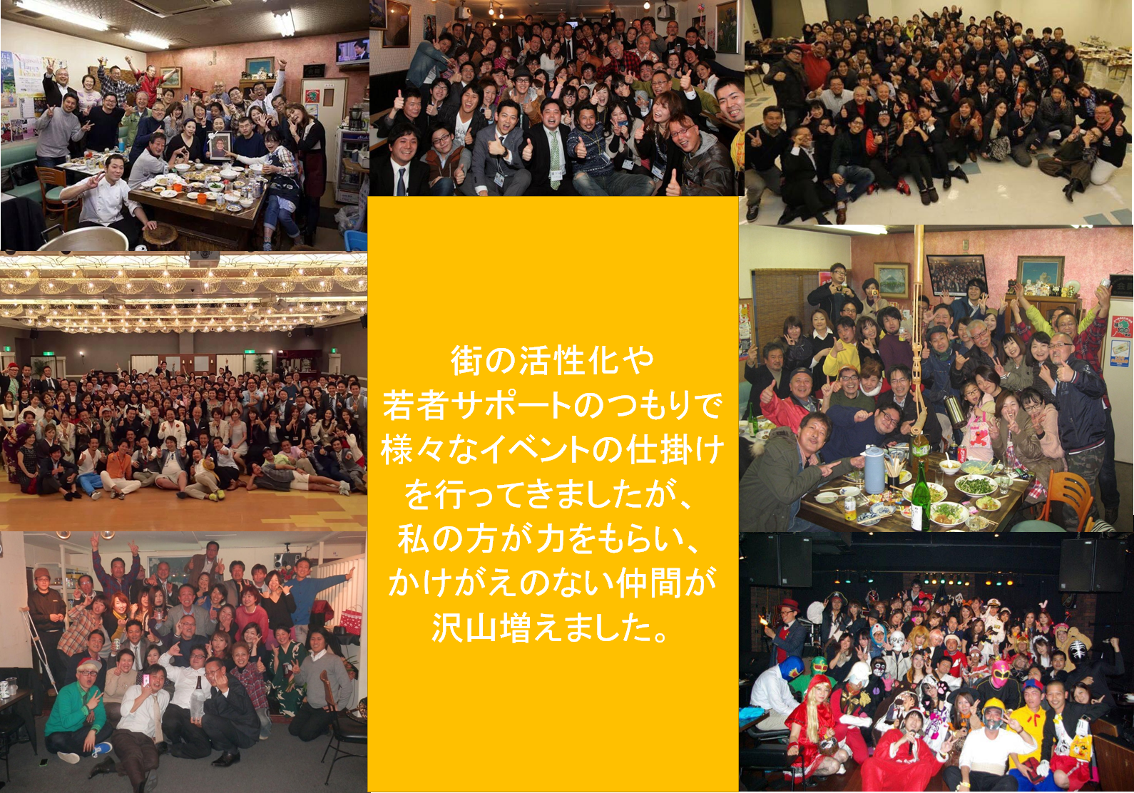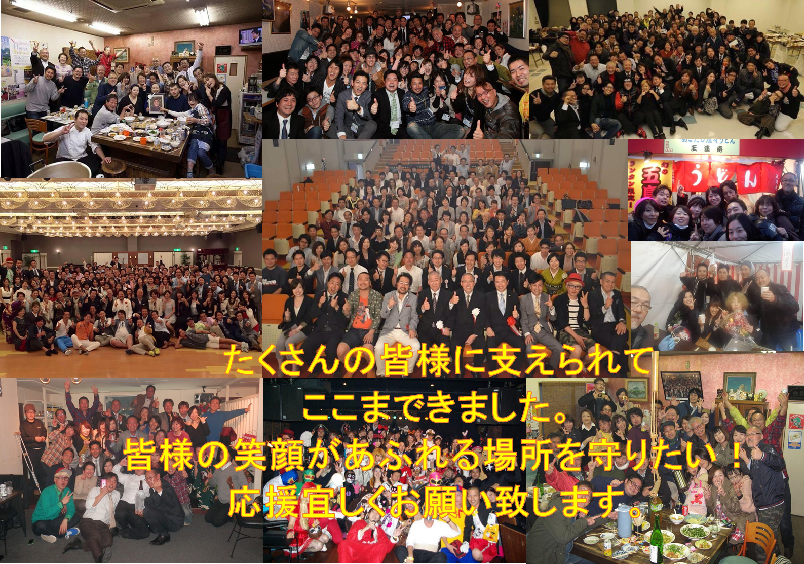 これまで多くのお客様に支えられ、お店を営業してきました。繁華街で行われた1,000人街コンや街の活性や若者のサポート等の目的で様々なイベントを街の皆さんと協力しながら行ってきました。このような活動の中で多くの方と出会い、私のお店で皆が集い、笑顔が絶えませんでした。そのような光景が忘れられず、また皆が笑顔で集える場所をつくりたいと思っています。