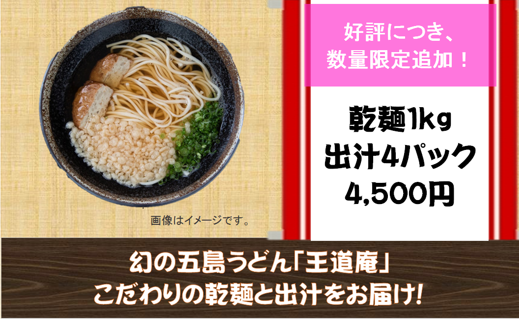 幻の五島うどん「王道庵」 の乾麺と出汁をセットにしてお届け致します。また、王道庵でお得にご利用頂けるお食事券もご準備致しました。