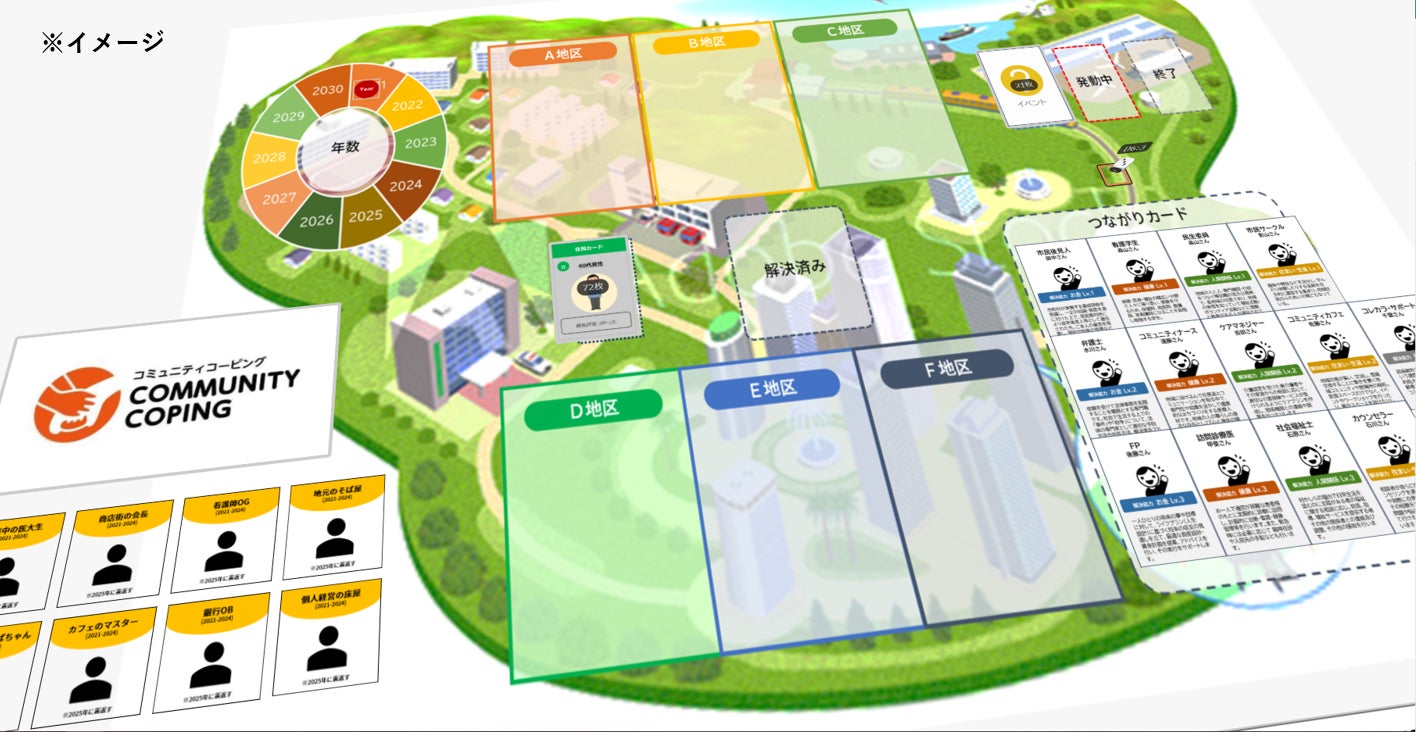 このゲームは、超高齢社会をテーマに、高齢者やその家族・親族に起きる悩みごとや、地域資源や専門職などが登場し、参加者同士でより良い地域社会の在り方を考えることができる内容になっています。