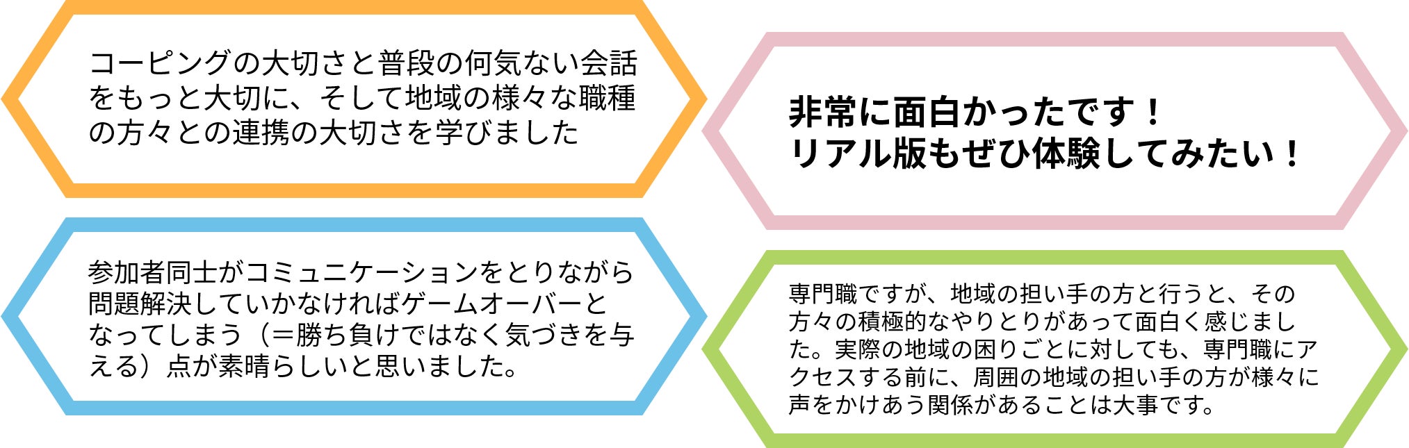 その中で、「課題解決には人とのつながりが欠かせない」ということを学び、まさにこのゲームは地域内のコミュニケーションやコミュニティの大切さを、多くの方に知っていただける良いきっかけになるのではないかと考えています。