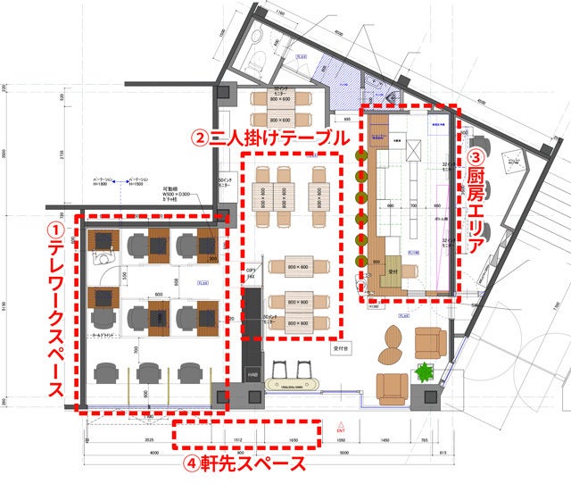 ④軒先スペース:平日ランチ時間帯は、店頭でテイクアウト商品を販売することが出来ます。
