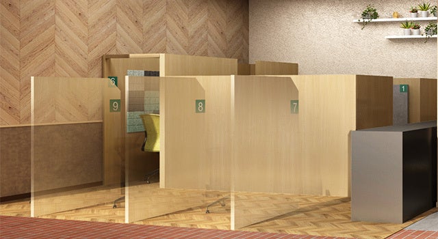 ①テレワークスペース:周囲を気にせずオンライン会議等が出来るように設計されています。