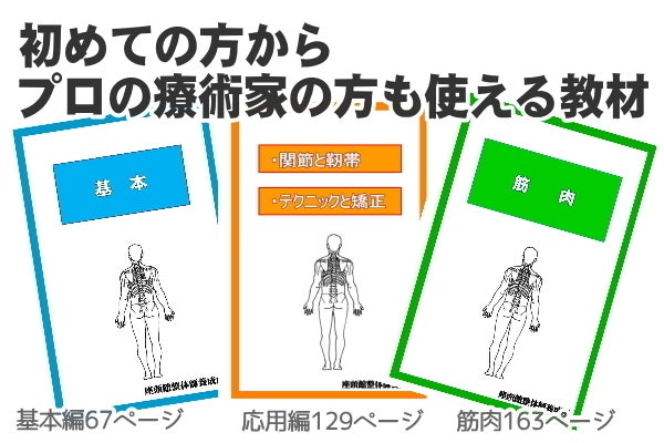 上記のすべての動画講習に座頭館整体のオリジナル教材をつけて、リモートでアドバイスを受けながらしっかりと「痛みを楽にする整体技術」を身につけます。