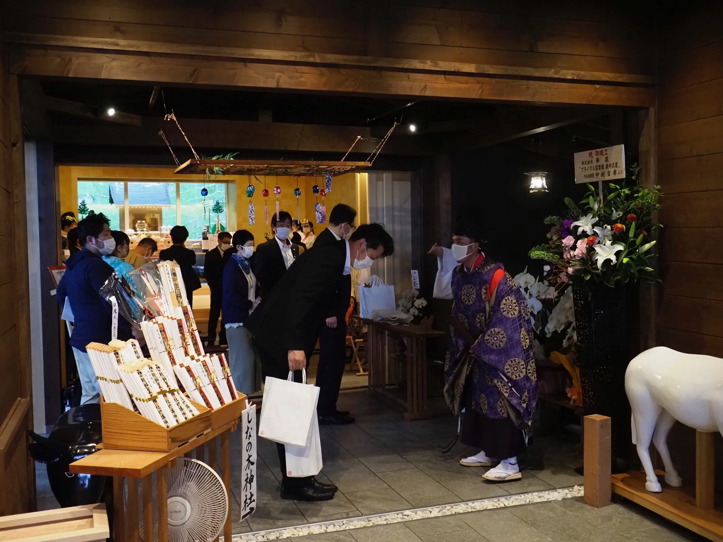 7月9日金曜日、境内の一連の工事が完了したことを受けて、ようやく竣工祭を執り行うことができました。コロナ感染拡大防止を念頭におき、神社に縁の深い方々、工事にご協力いただいた軽井沢町の方など、ごく限られた人数を招き非公開で実施いたしました。