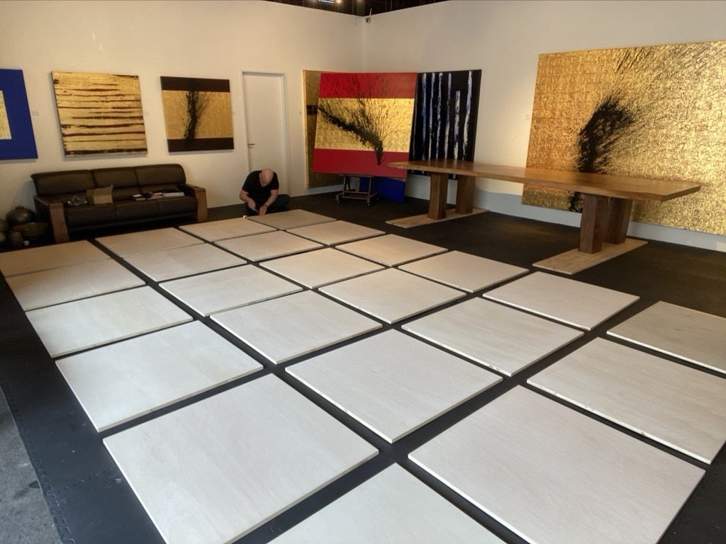 今日は、デイビットさんが製作されている新社殿の天井絵の作ってる様子をお伝えします。最初の写真は、24枚の木製パネルをならべたところです。これに一枚づつ金箔を貼ってニスを塗り下地を揃えた上から絵を描き完成されます。まず最初の作業は、24枚の木製パネルに一枚10cm四方の金箔を手で張り込みます。この写真は、金箔を貼り終わったあとの状態を確認しているところです。金箔の状態を確認して余分な金箔があるところは,それを落とし整えてて行きます。この写真はその様子です。デビットさんの作業は今も続いていますが、社殿のお披露目まではこの先の作業は内緒としておきたいとのことですので、次に天井絵をお伝えするのは、取り付け作業の様子とかになるかと思います!熊野皇大神社の御神徳をみなさまに!