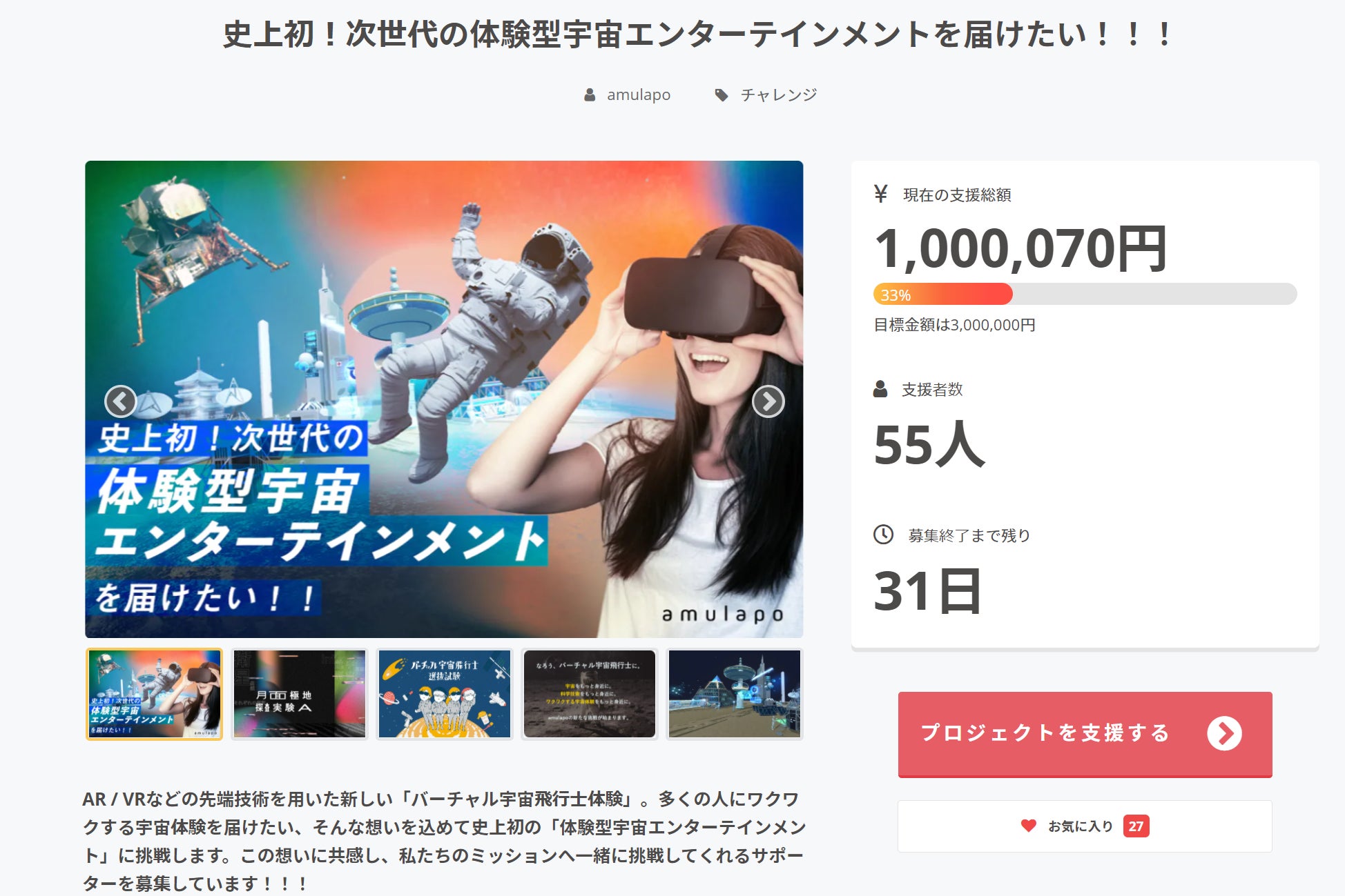 こんにちは、amulapoです!!応援コメントとして、元AKB48で現在は女優やタレントとしても活躍中の前田亜美様よりメッセージをいただきました!それだけでなく、前田様はみんソラコミュニケーターとしてたくさんの人に宇宙の楽しさを伝える活動もされています。私たちamulapoもデジタル技術を使って「宇宙を身近に」という目標を掲げて活動しているので、これまでも前田様と一緒に連携した活動を行ってきました。特に、amulapoの鳥取砂丘での宇宙飛行士体験に関して、PV撮影や体験の活動のプロモーションも含めてご協力いただいています!!以下、応援コメントです!------------------------------------私もこの月面都市VR、AR体験をさせて頂きました!現実の世界と未来が融合されていて本当に月面に到着した感覚になりました!アトラクションのような感じがして楽しかったです!文字や音が出てくるのも新感覚でビックリ!これからの宇宙ビジネスはユーザーの意見が大事だと思います。近い将来本当に月に行けるかも?笑その前に…是非!!体験してもらいたいです!------------------------------------前田様、応援コメントありがとうございます!!私たちも、前田様のように多くの人に笑顔や元気を届けられるような宇宙体験をつくっていきます!引き続き応援よろしくお願いいたします!