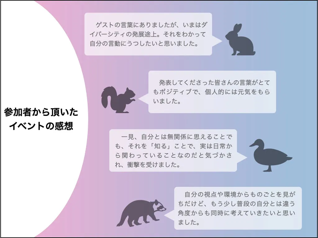 私たちはこれまでのイベントを通じ、マイノリティとマジョリティの間にある見えない壁、マイノリティならではの悩みや生きづらさを知るようになりました。同時に、その課題を解決しようと活動されている方と触れる機会を得る事が出来ました。