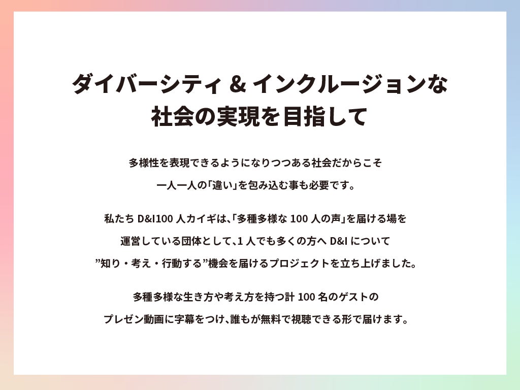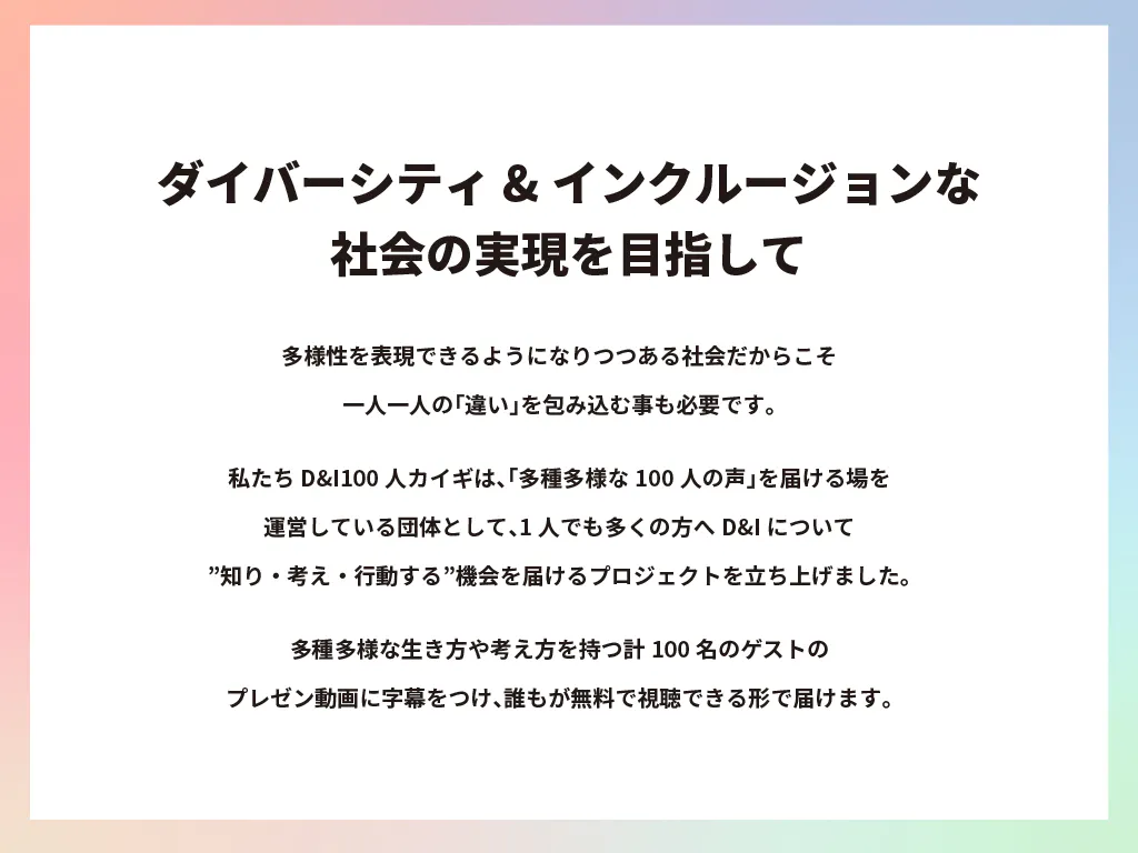 このプロジェクトでは、D&I 100人カイギの登壇ゲスト全員の実際の経験や活動による言葉を動画として編集・作成し、YouTubeへ公開する事で全ての人がD&Iについて知り、考えるきっかけを作りたいと考えています!!!