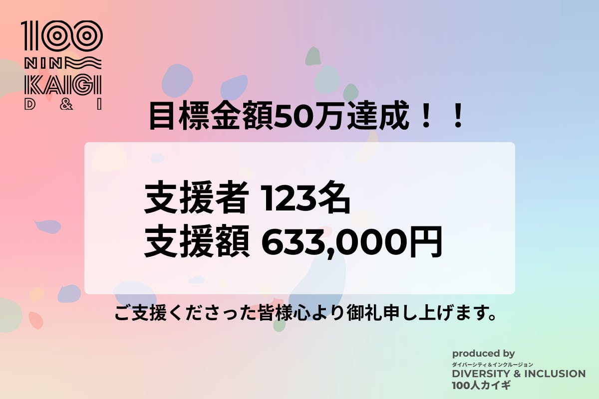 2021/04/22 07:00お世話になっております。DIVERSITY & INCLUSION 100人カイギ運営チームです。この度は、DIVERSITY & INCLUSION 100人カイギの挑戦を応援していただき、誠に有難うございました。心より御礼申し上げます。2021年3月18日から4月20日までの期間で、123名から633,000円のご支援を頂きました。目標金額の500,000円を大きく上回ることができました。皆様がご支援・いいね・シェアをしてくださった皆様のお陰です。本当にありがとうございます。皆様から頂いた貴重なご支援は、イベントにご登壇頂くゲスト100名のプレゼンテーションをYOUTUBEにて一般公開する映像・字幕編集費用をメインに、一部を残り14回の開催の運営費用に、1円も無駄にすることなく充てさせて頂きます。今後のイベントなどの詳細につきましては、FacebookとTwitterにて発信致しますので、是非そちらをご覧ください。Facebook:https://www.facebook.com/Twitter:https://twitter.com/DI100ninkaigiまた、次回のイベントは5月11日(火)19:00-21:00にZoomで開催致します!詳しくは以下のページをご覧ください。URL▶ https://di100ninkaigi-07.peatix.com/皆様のご参加をお待ちしております。それでは、引き続きよろしくお願い致します。ーDIVERSITY & INCLUSION 100人カイギ ー100人カイギはゆるいつながりを作るコミュニティ活動です。「DIVERSITY & INCLUSION」をテーマに、毎月ゲストを5名お招きし、ゲストが100名に達した時点でイベントは終了します。第2火曜日に実施中。HP:https://100ninkaigi.com/area/di もっと見る