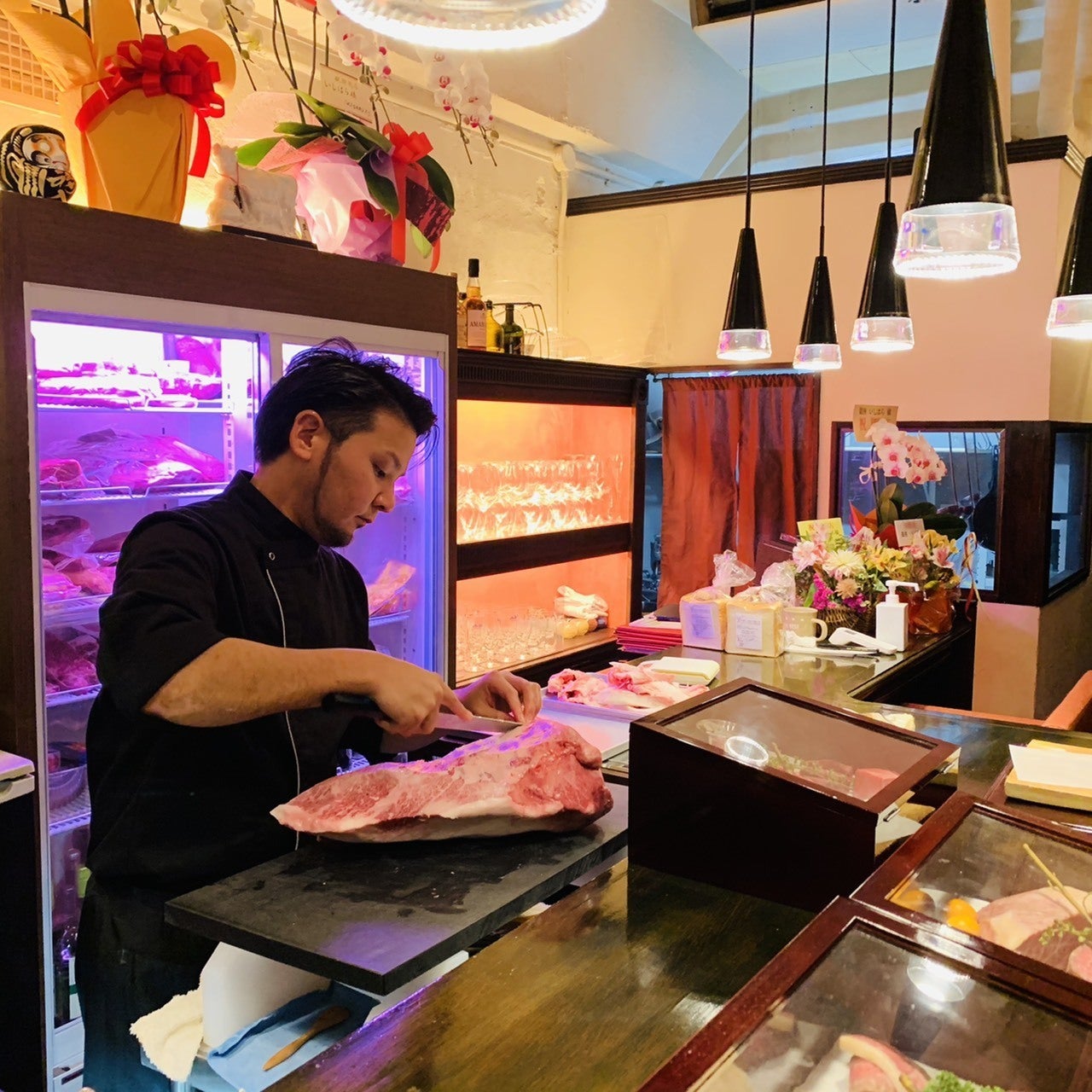 1990年、滋賀県に生を受け、15歳より滋賀県の名店 焼肉「慶州」にアルバイト・キッチン採用で入店。そこからお肉に携わり続けて今年で16年目になります。慶州では近江牛を一頭買いしており、頭〜尻尾まで牛肉全てに触れさせていただきました。内臓の下処理はとても手間がかかりますが、やりがいがあって今でも大好きな工程です。包丁の入れ方で変わる味。お肉とふれあう中で知る和牛、輸入牛の長所と短所。人と同じように一頭一頭性格の違いがあり、個体差で味も変化すること。たくさんのことを学びました。牛肉のことを知れば知るほど愛おしくなり、2013年、慶州の料理長にまで上り詰めました。いつかは美食家が集まる街、東京に進出をしたいという夢を持ち続けていたところ、縁あって銀座にお店を構える事が出来ました。