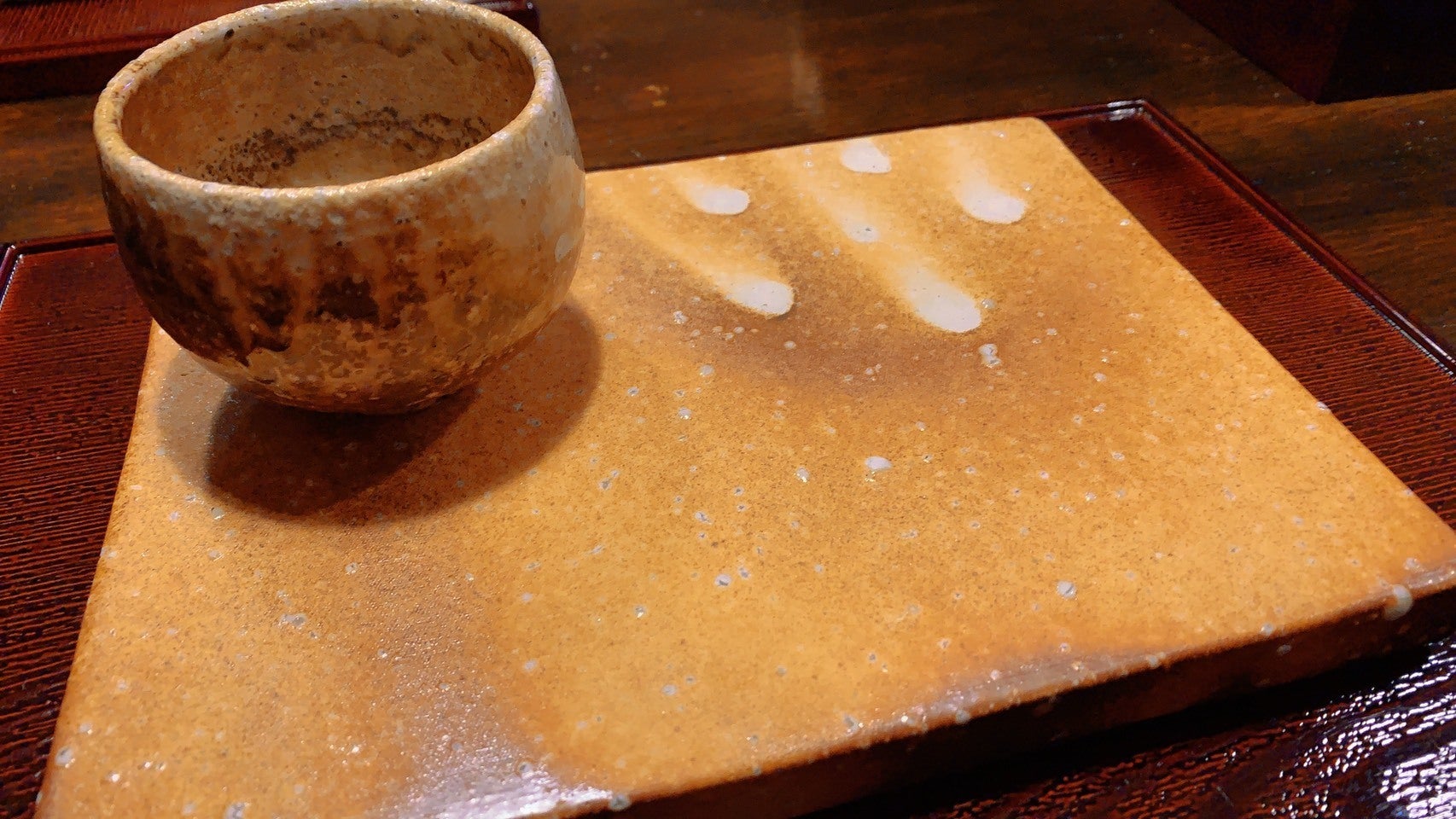 こだわりはお肉だけではありません。視覚からも味わっていただけるようご用意したのがこの緋色に輝く盛り板です。これは、私の地元である滋賀県の信楽焼です。窯元の忠六苑様にお願いし登窯にて仕上げて頂きました。赤松の自然釉が美しく、盛り板の上に置かれる碗の底には美しいビードロがさらに食事を盛り上げてくれます。修行時代より信楽の虜となり一番お肉を美味しくいただく器だと思っています。