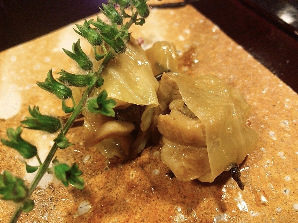 ミンチと丁寧に下処理をしたモツをキャベツで巻き、モツの旨味を染み込ませた逸品。いしはらのスペシャリテの大人気商品です。