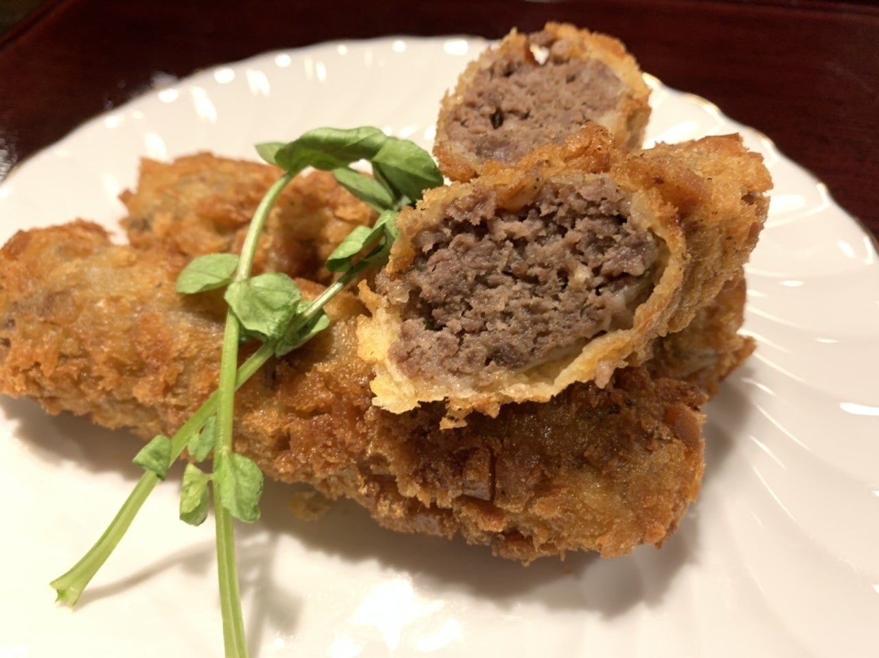 ユッケにも使用できる和牛100%のメンチカツ。肉汁が溢れシルクの様なサラリとした上質な脂が特徴です。