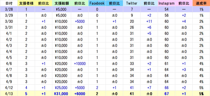 プロジェクトも残り1週間となりました。現在支援者様の数は5人、総支援額は3万1000円とかなり厳しい状況であります。リアルでお会いする方々にも支援・拡散をお願いしておりますが、なかなか私たちのプロジェクトの良さを伝えきれず色よい反応をいただけていません。しかしある方に「しっかり理解してもらえれば100人ぐらいに支援してもらえるプロジェクト」と背中を押していただきましたので、引き続き励んでいこうと思います。今の我々にできるのはとにかくプロジェクトの良さを発信して皆様にご支援を呼び掛けることのみです。これを読んでいる皆様がSNS等での宣伝・さらなる支援などしていただけると大変ありがたいです。最後の1日まで決してあきらめるつもりはありませんので見守って、いやさらなる支援をいただけると幸いです。