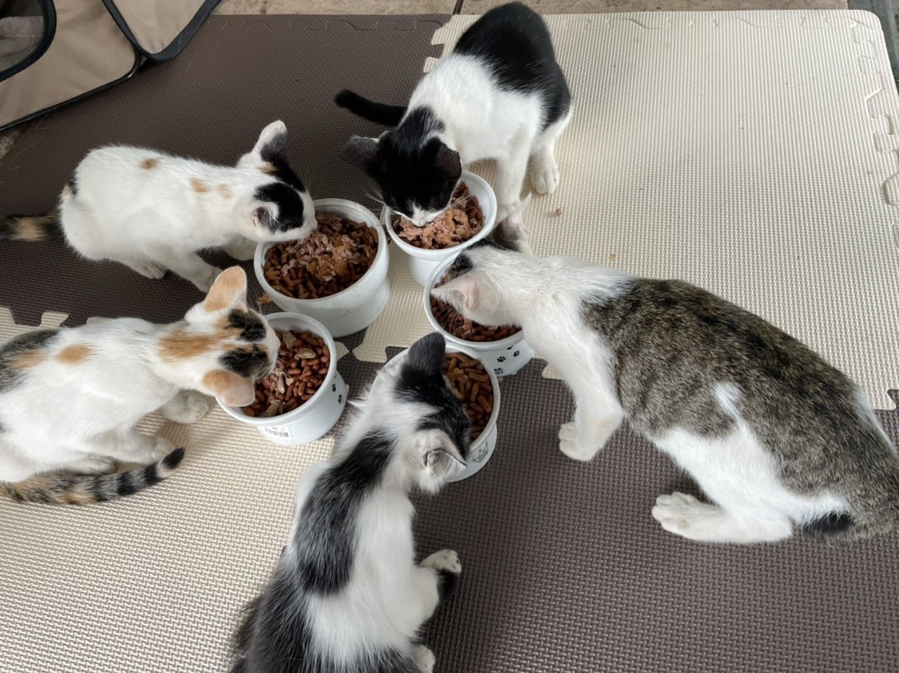 母猫のメルちゃんだけ保護できず、野良猫のオスに付いていって来なくなってしまったため子猫5匹だけ先に保護しました。