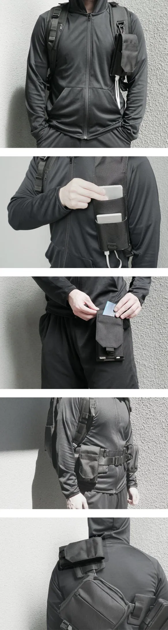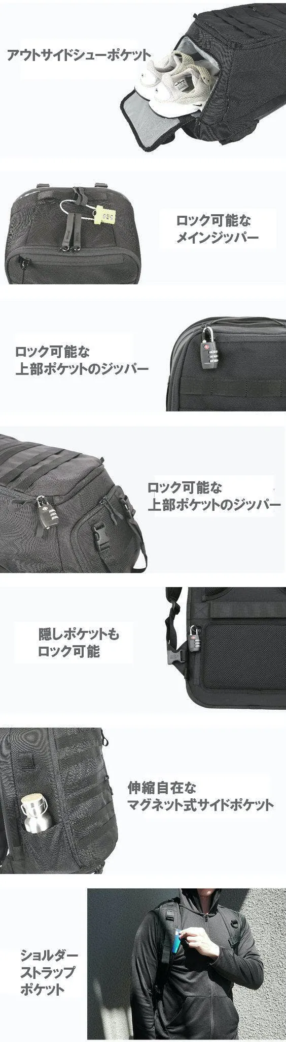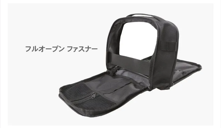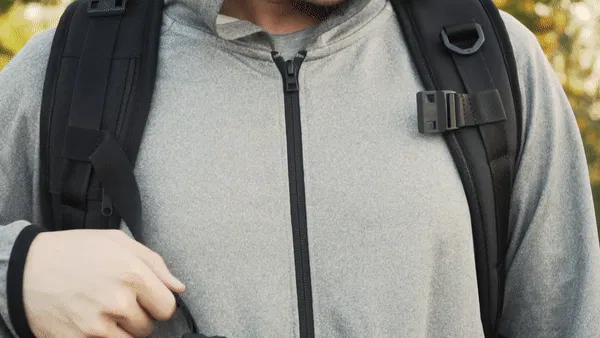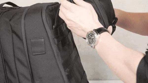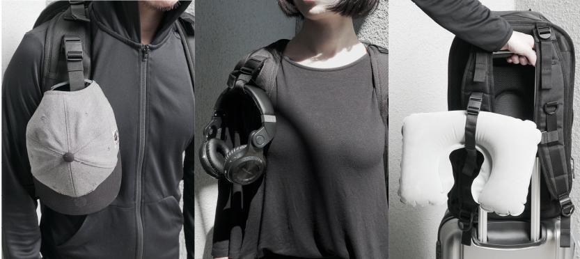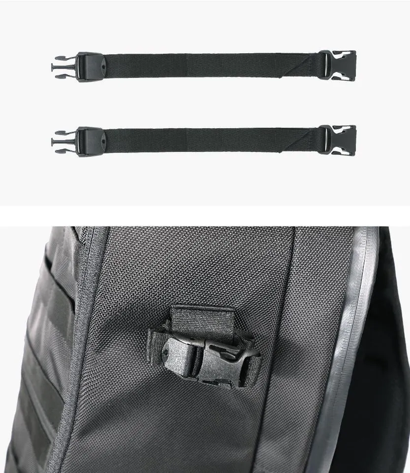 (1)付属ポーチはバックパック本体外側の上段と下段に取り付けることができます。磁気バックルで簡単に取り外し可能な上、最大30kgの負荷にも耐えられるので安心です。
