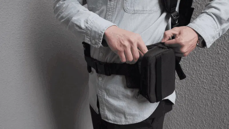 Modular BeltをBagram Pack本体に取り付ければ、パスポートやお札・小銭などすぐに取り出したいアイテムを、ウェストポーチのように腰に固定することができます。
