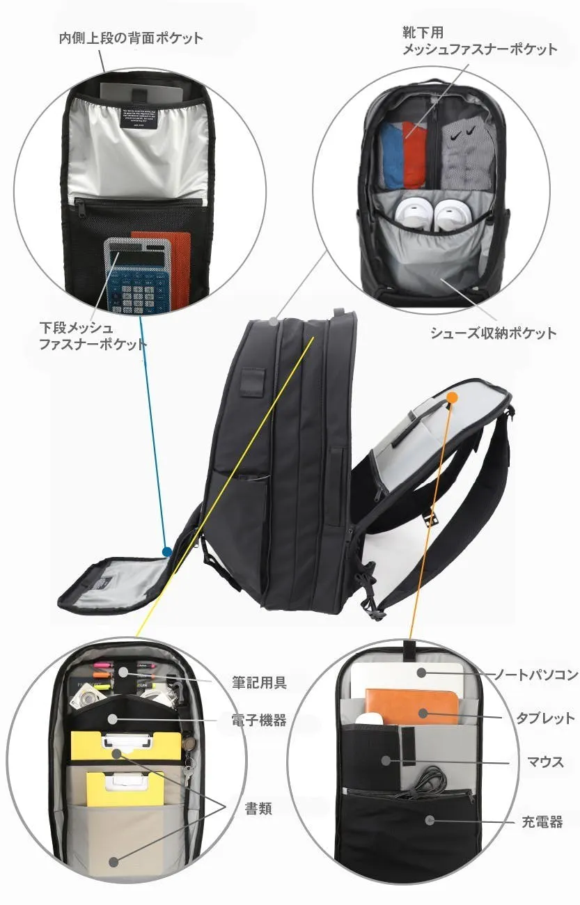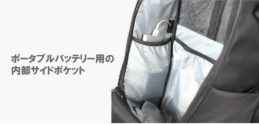 他にはボトルや折り畳み傘を入れるのに便利な 伸縮自在なマグネット式サイドポケットや、ショルダーストラップにスマートフォンや定期などを入れるのに便利なポケットを搭載しています。