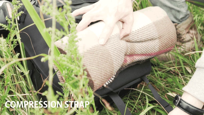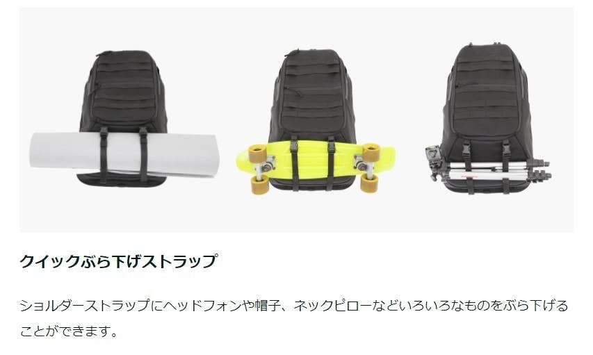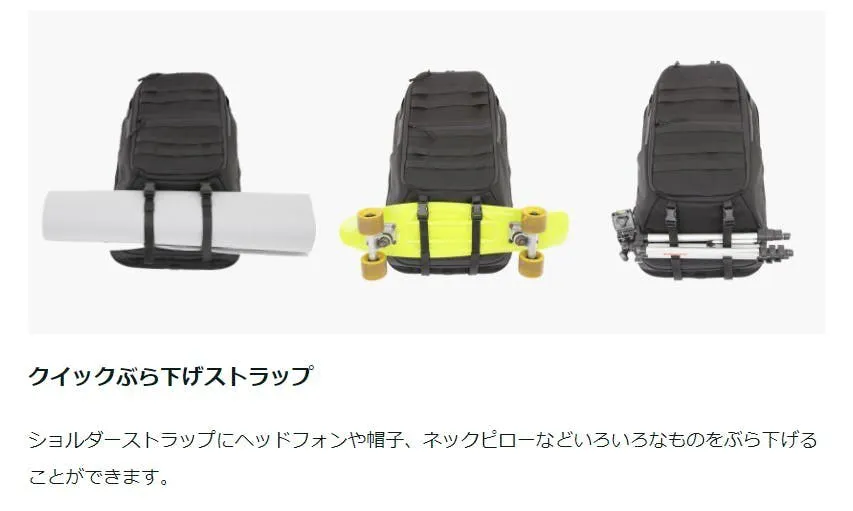 2.0 Bagram Pack本体下部のストラップは、ヨガマット・ブランケット・ミニスケートボードなど幅を取るものを取り付けることができます。