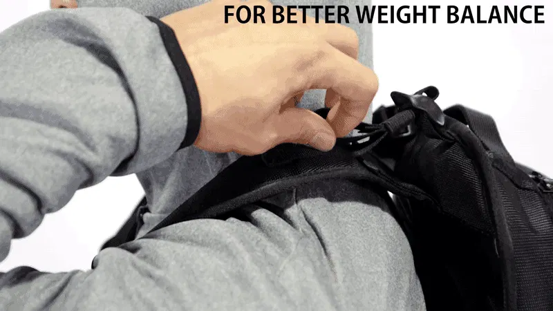 ウェイトバランスストラップを調整して、身体に密着し、肩への体重の圧力を減らします。