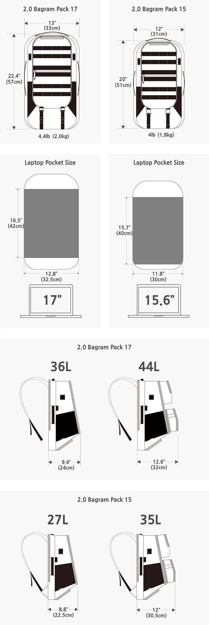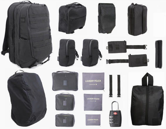 Bagram Pack15または17(本体)、シューケース、パットハンドル、バックルストラップ×2本、レインカバー、モジュラーベルト2.0、パッキング&ランドリーポーチセット、TSAロック、L Pouch 2.0、RFID BP Pouch 2.0、i Pouch 2.0 、S Pouch 2.0×2個