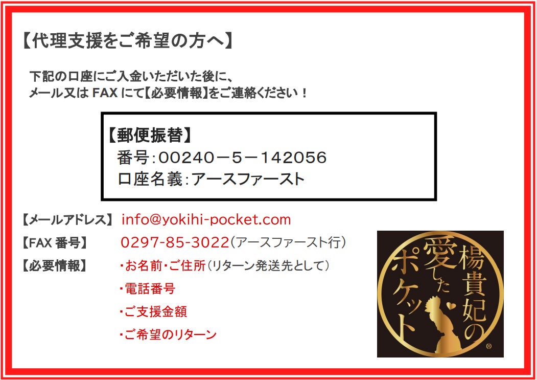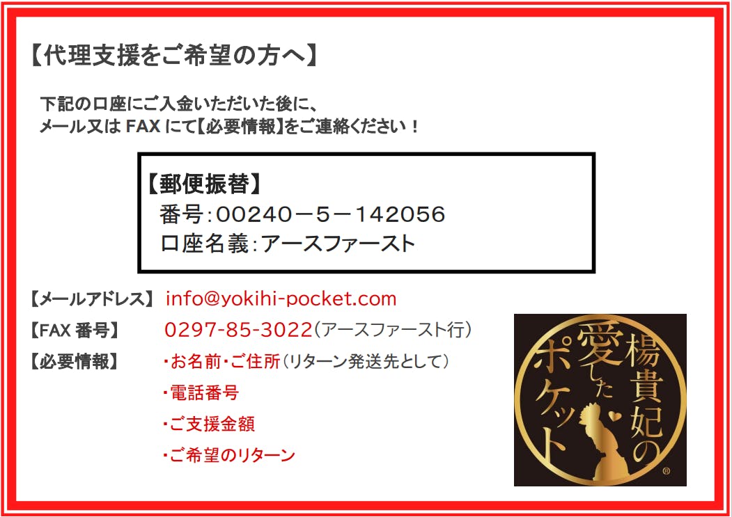 お預かりした支援金は、楊貴妃ポケット事務局が責任をもって、クラウドファンディングのご希望のリターンへの支援を行うために手続きをさせて頂きます。もし知人などで支援の仕方が分からない方がいらっしゃいましたら、ぜひご紹介下さい!