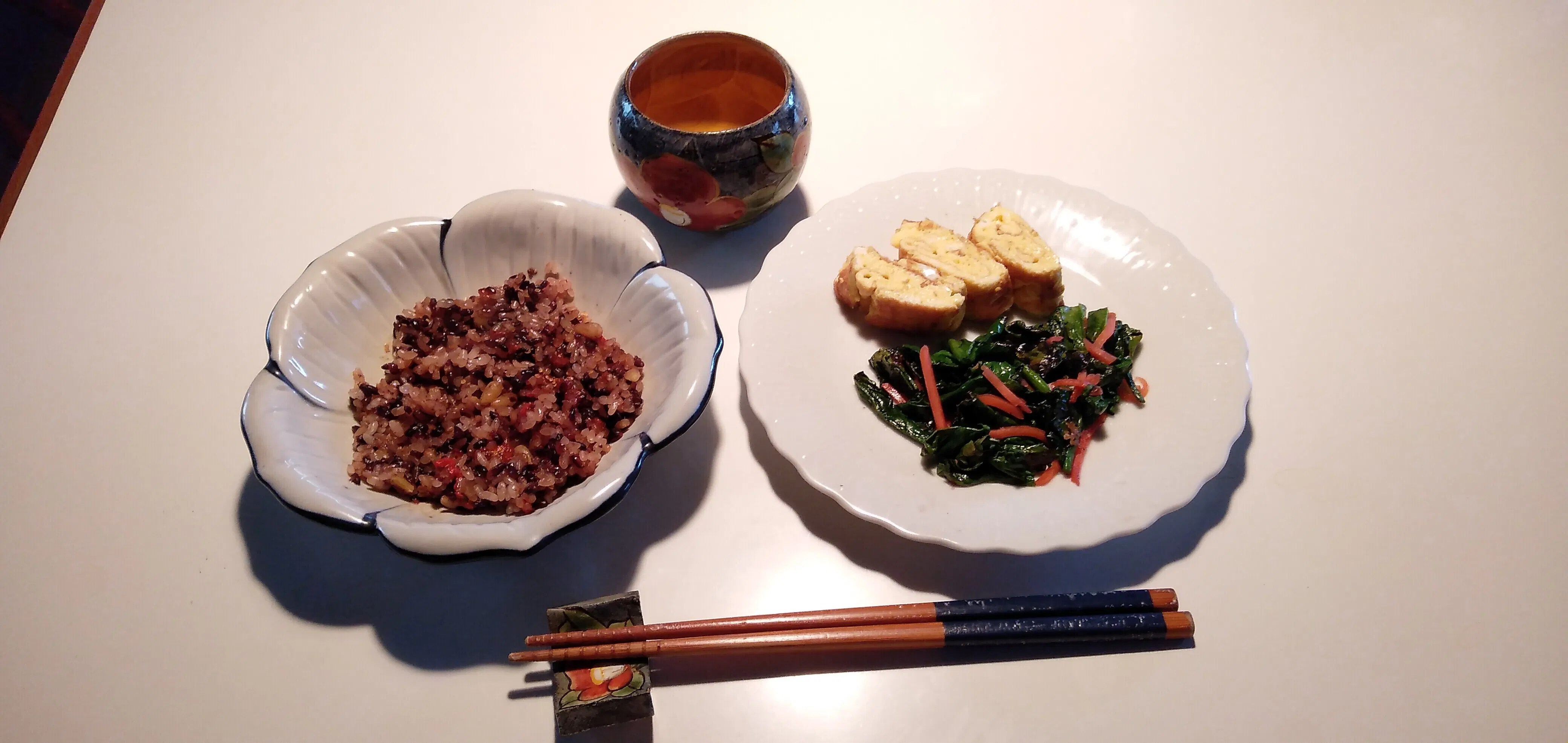 薬膳おこわはレンジでチン!して盛っただけ。おかずは厚焼き卵とほうれん草と人参の和え物です。しっかり噛んで食べたせいか、このくらいが丁度の量。