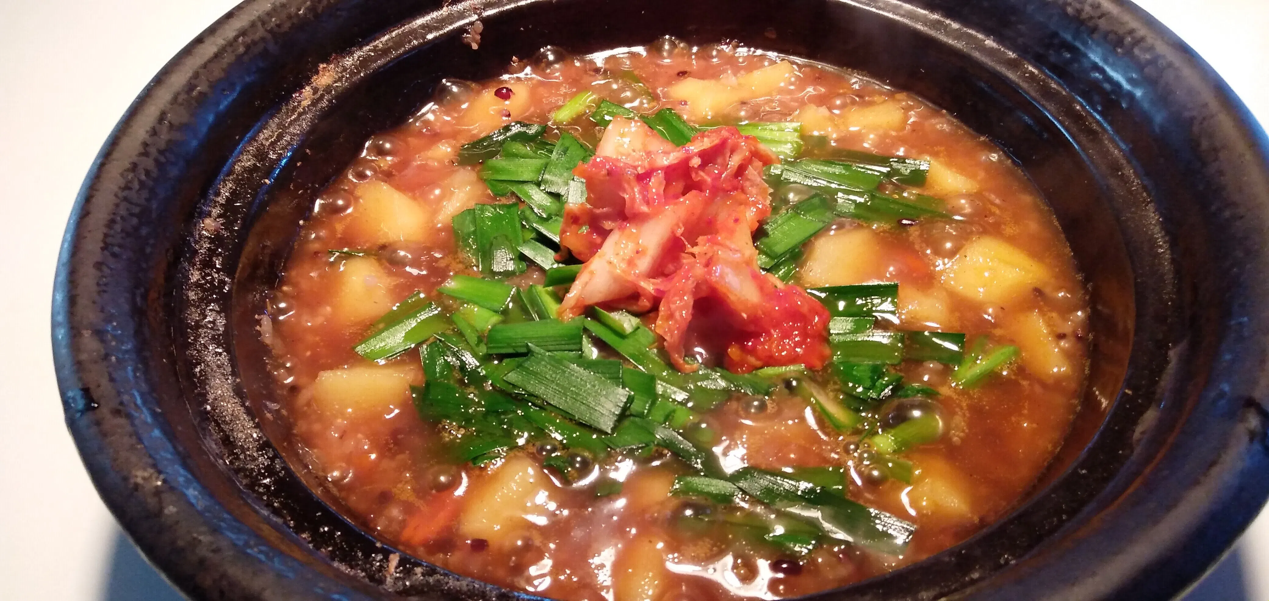 ②鍋をおろす直前につゆの素とニラを入れ、一煮立ちして火を止め、キムチをのせて出来上がり。