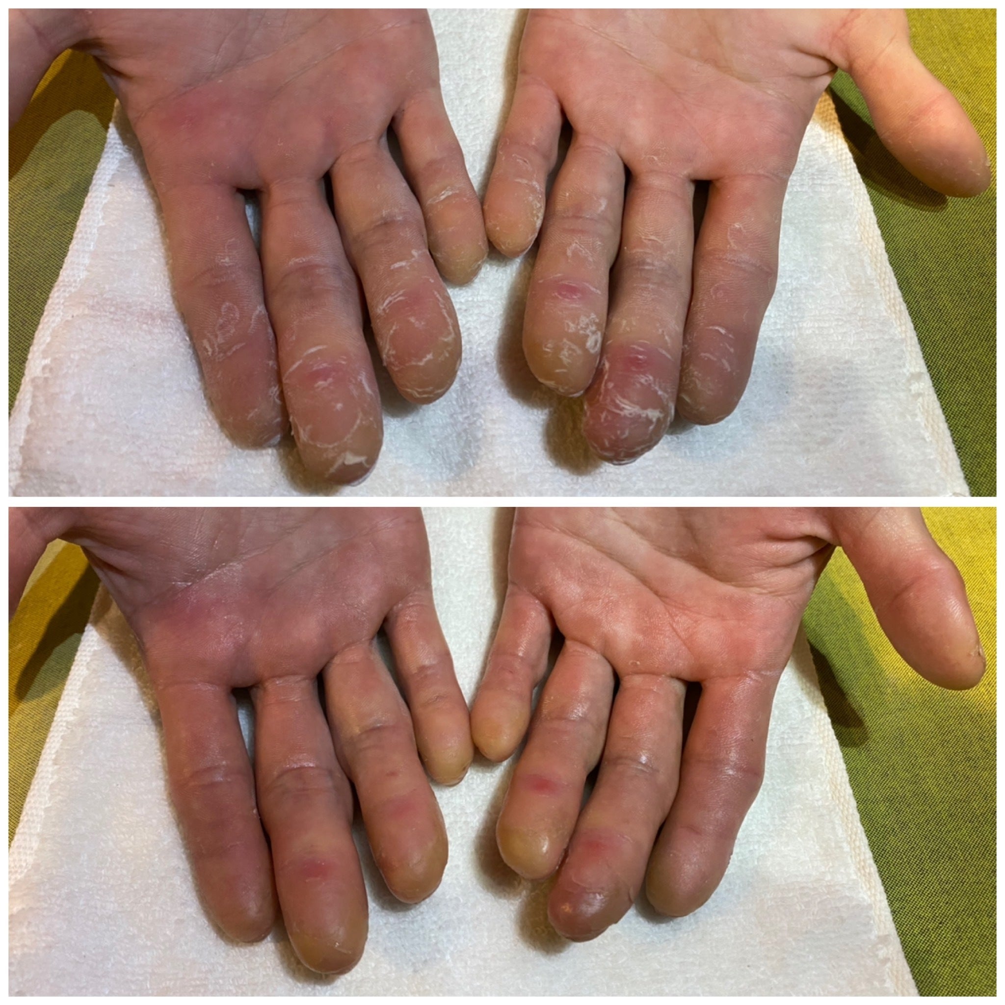 角質化が進み、手のひら側の表皮の凹凸が激しく、痛々しい状態でした。