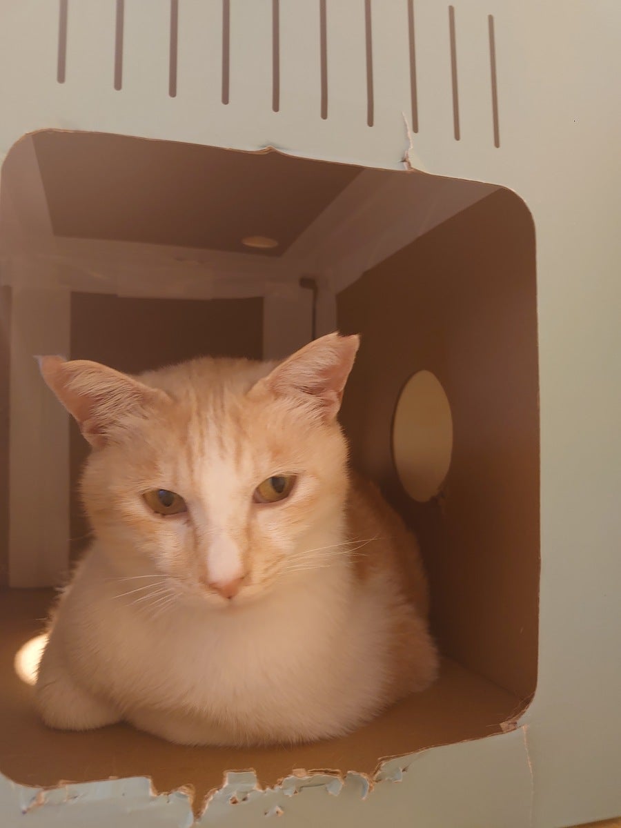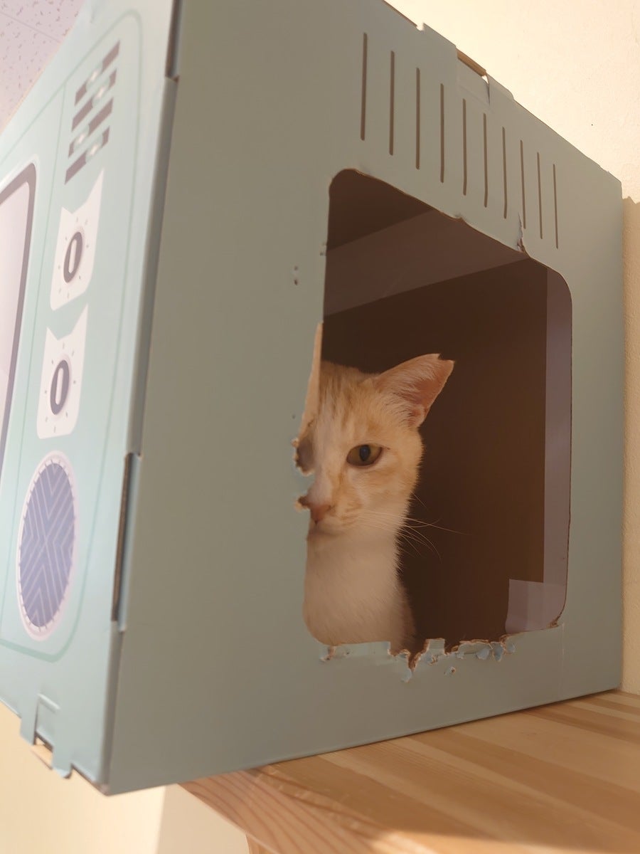 入り口のボックスに座り、猫ちゃんと遊んでいると、誰かに見られている!?とキョロキョロ。テレビボックスからこちらを見ていたラッキー君。