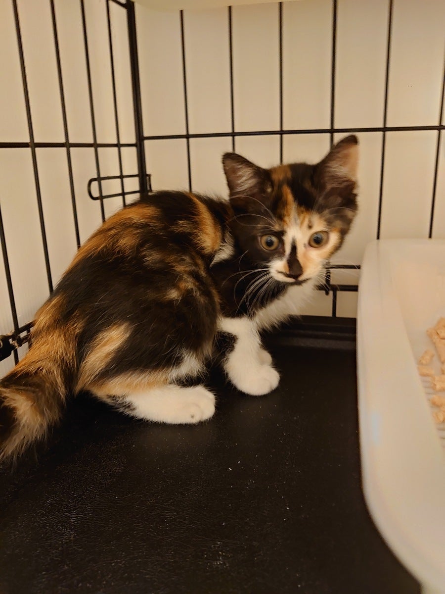 三毛猫のアズマちゃん。2ヶ月の女の子。人が大好きなスリゴロちゃん。3匹の中で一番姉御肌。